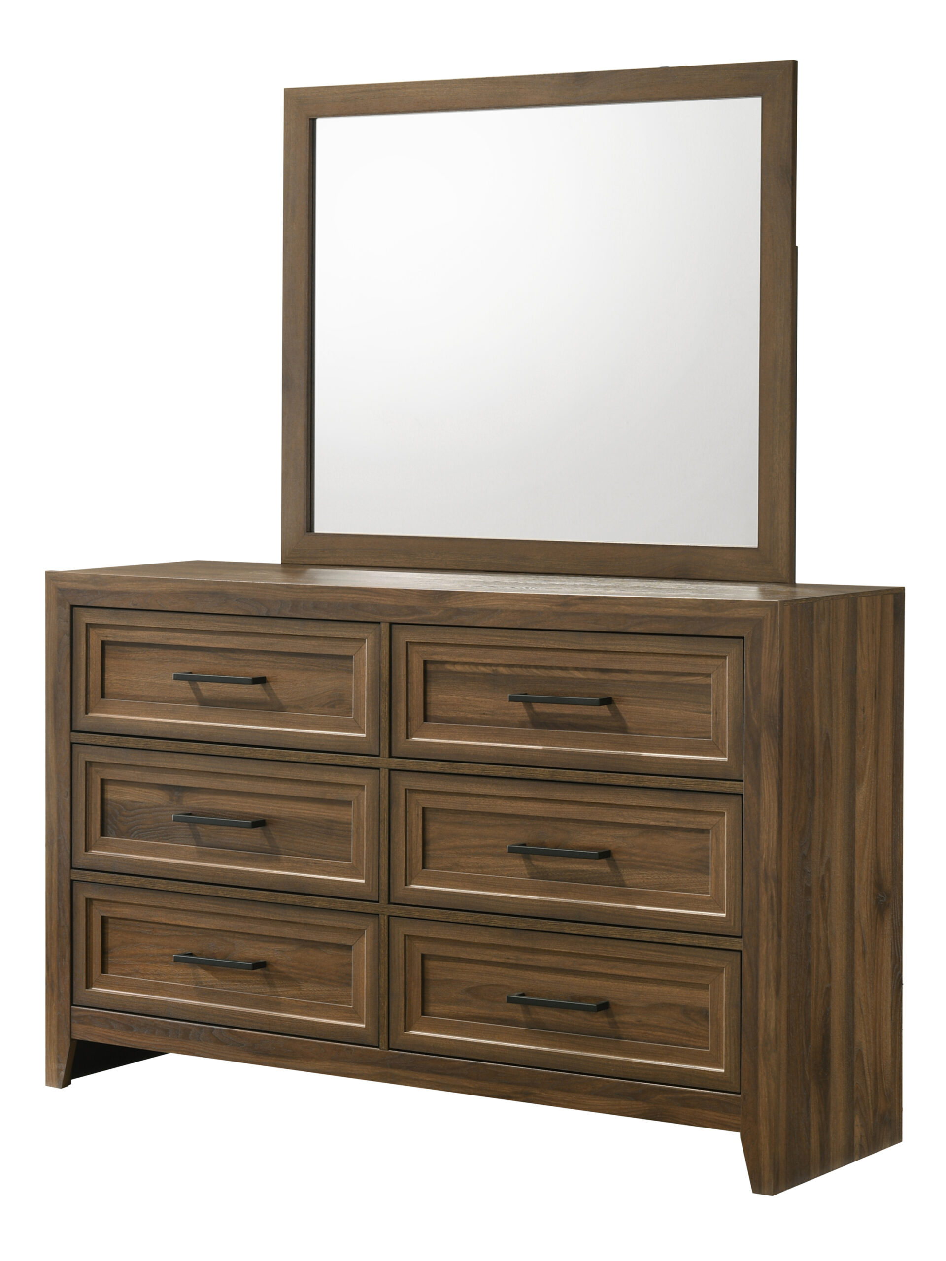 This bedroom set embodies a refined elegance with its rich black hue and luxurious textures, perfect for creating a serene and sophisticated sanctuary. The centerpiece is a sumptuous bed framed by a headboard with diamond-tufted detailing, offering a touch of opulence. The accompanying pieces, including a dresser with a gracefully matching mirror, tall chest, and nightstand, all feature a textured finish that adds depth and character to the suite.