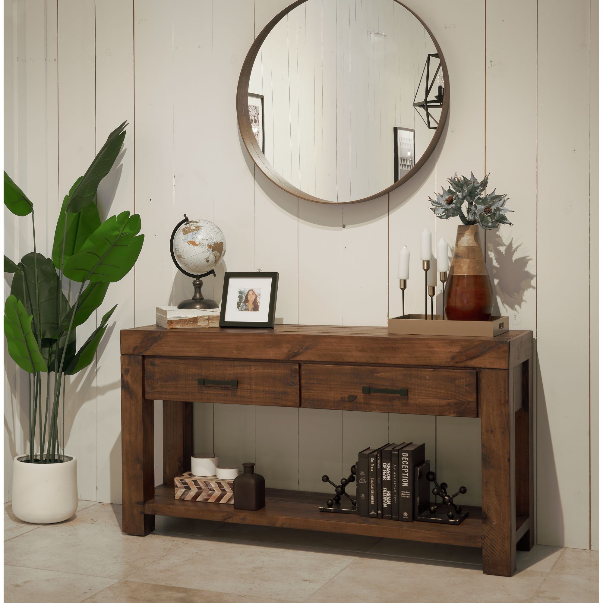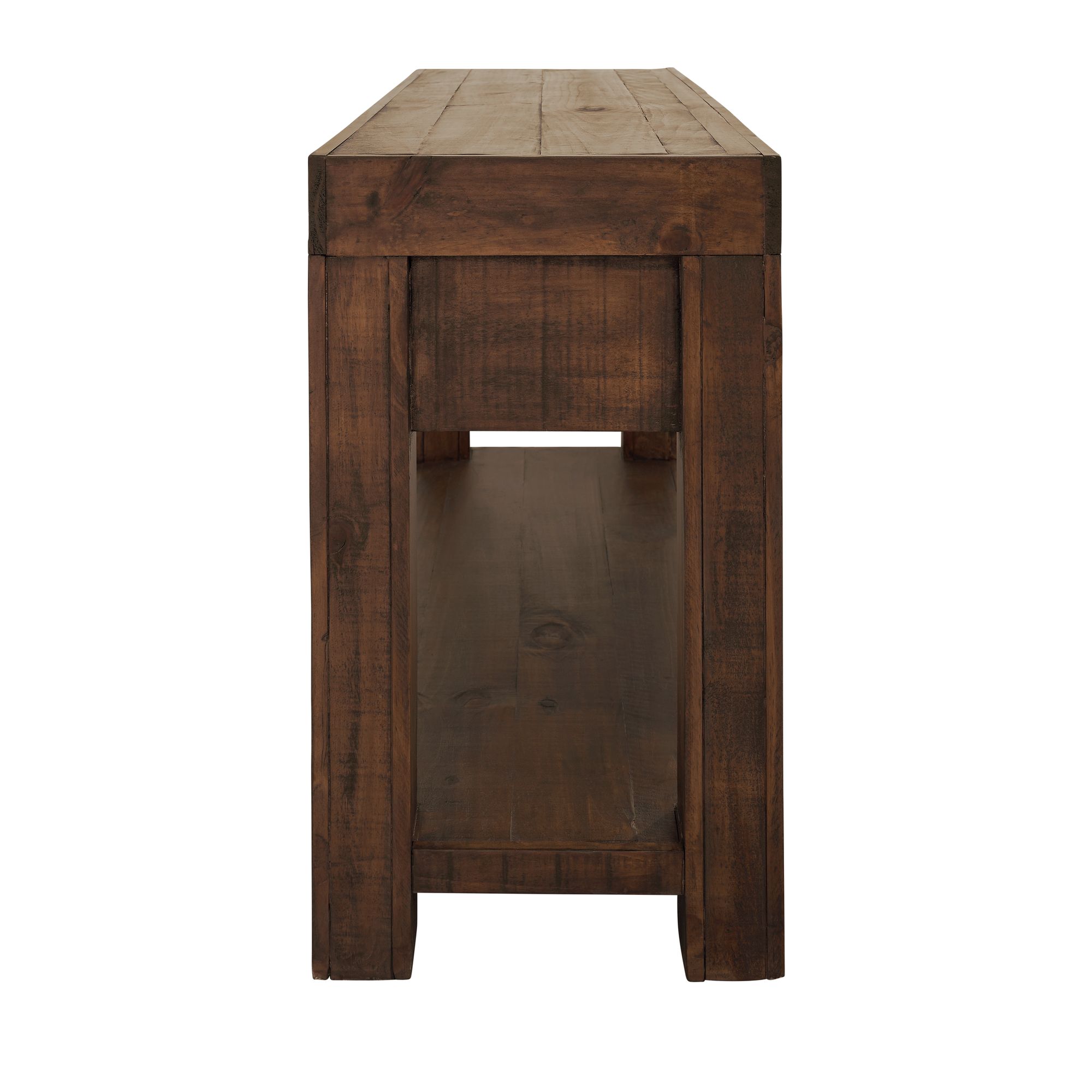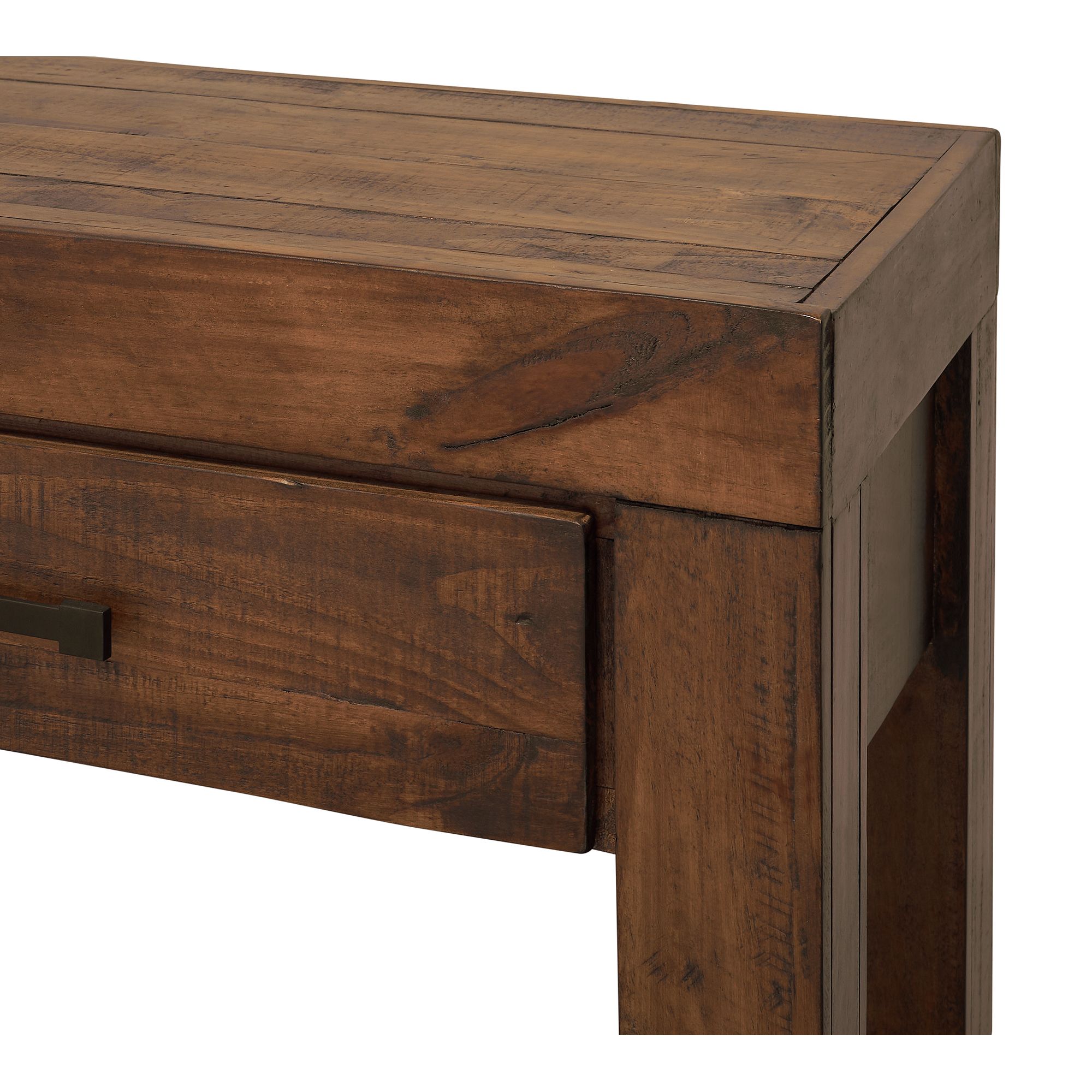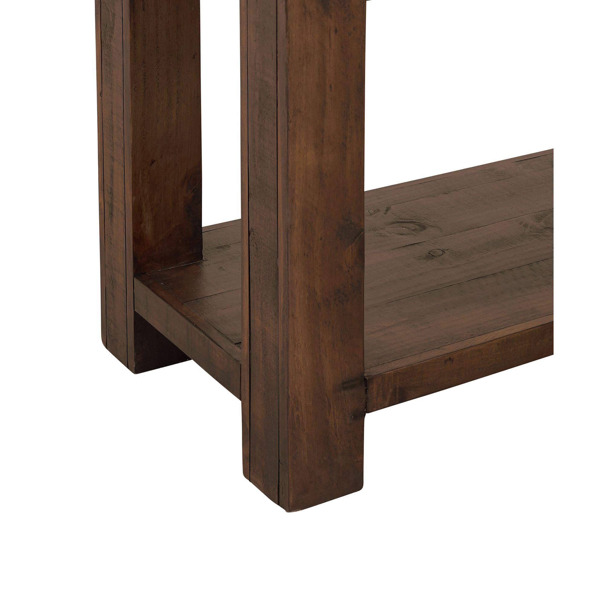 Add this beautiful, dark console table to your entryway, hallway, or other room for a touch of rustic flare and contemporary simplicity. Adorn it with some treasured family photos and add some extra shelving decor at the bottom for a balanced look. Its unique variation in tone adds to its character and appeal. 1 Year Limited Manufacturer Warranty