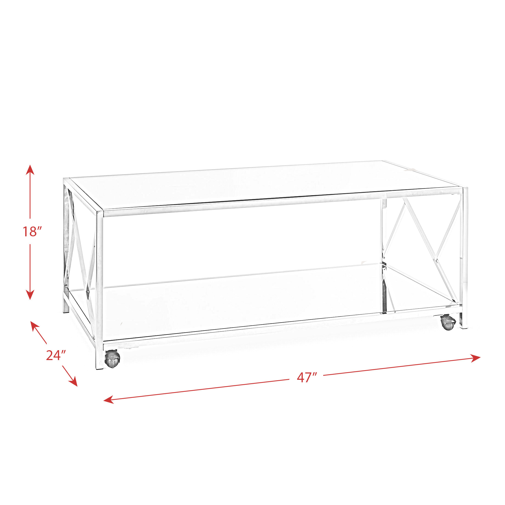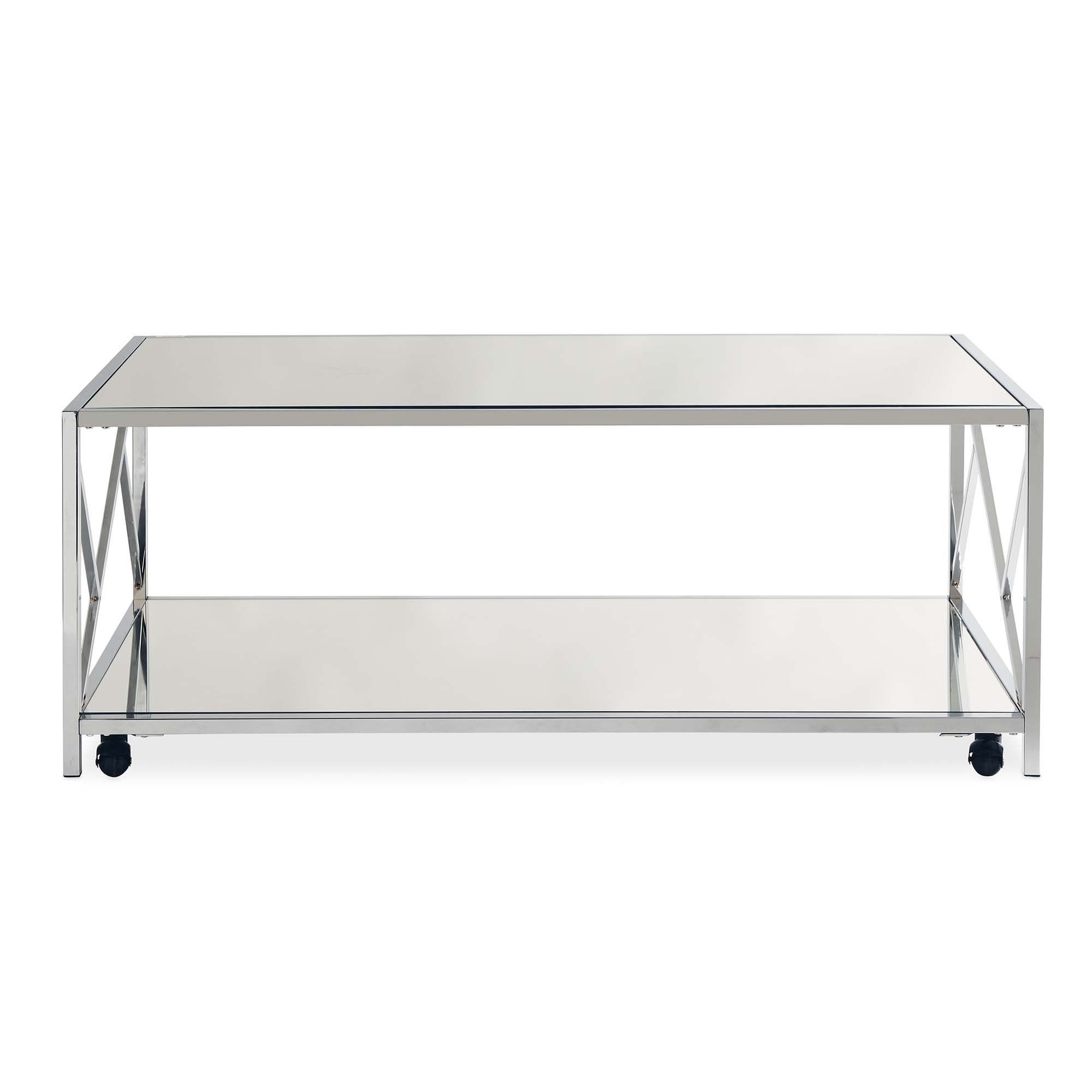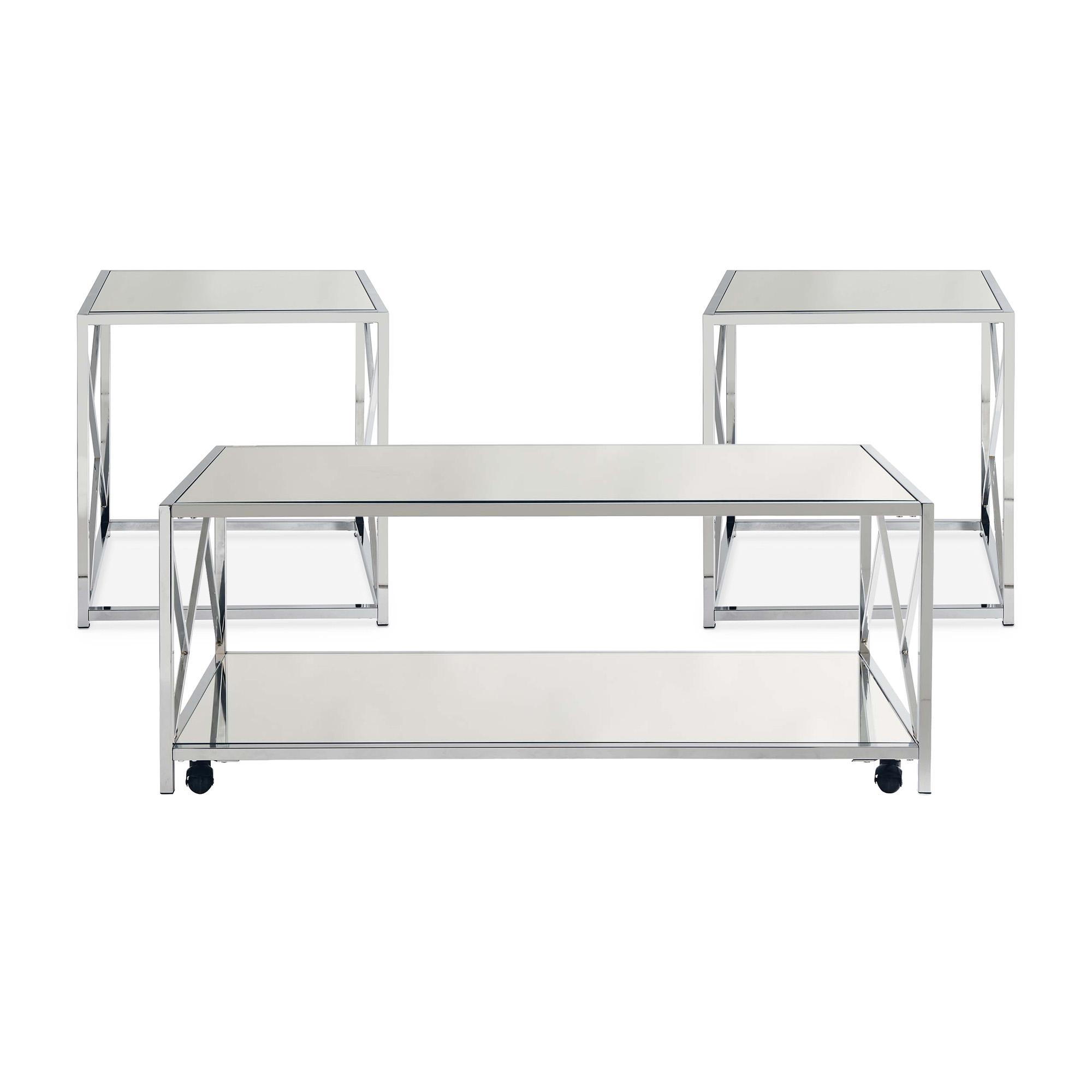 The Braden 3PC Occasional Table Set brings the glam to your home! This trio includes a coffee table and two end tables; making it the ideal living room setup. These accent tables come in a trendy chrome finish, while the table tops are mirrored. The coffee table comes with an extra feature, a mirrored bottom shelf to properly display your favorite decor. On the table ends, an intricate, yet simple design takes place to add a little extra flair to this already stylish set. The coffee table comes with casters; if youre not a fan of the casters dont worry, you can easily remove them. Add this Braden group to your home today for a look that will last year after year. 1 Year Limited Manufacturer Warranty