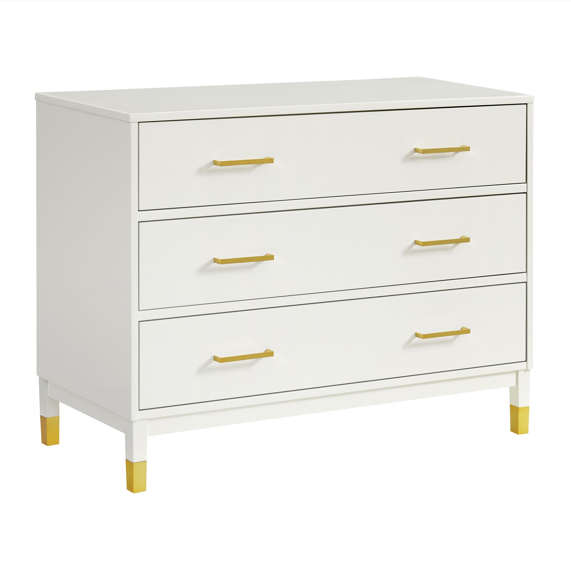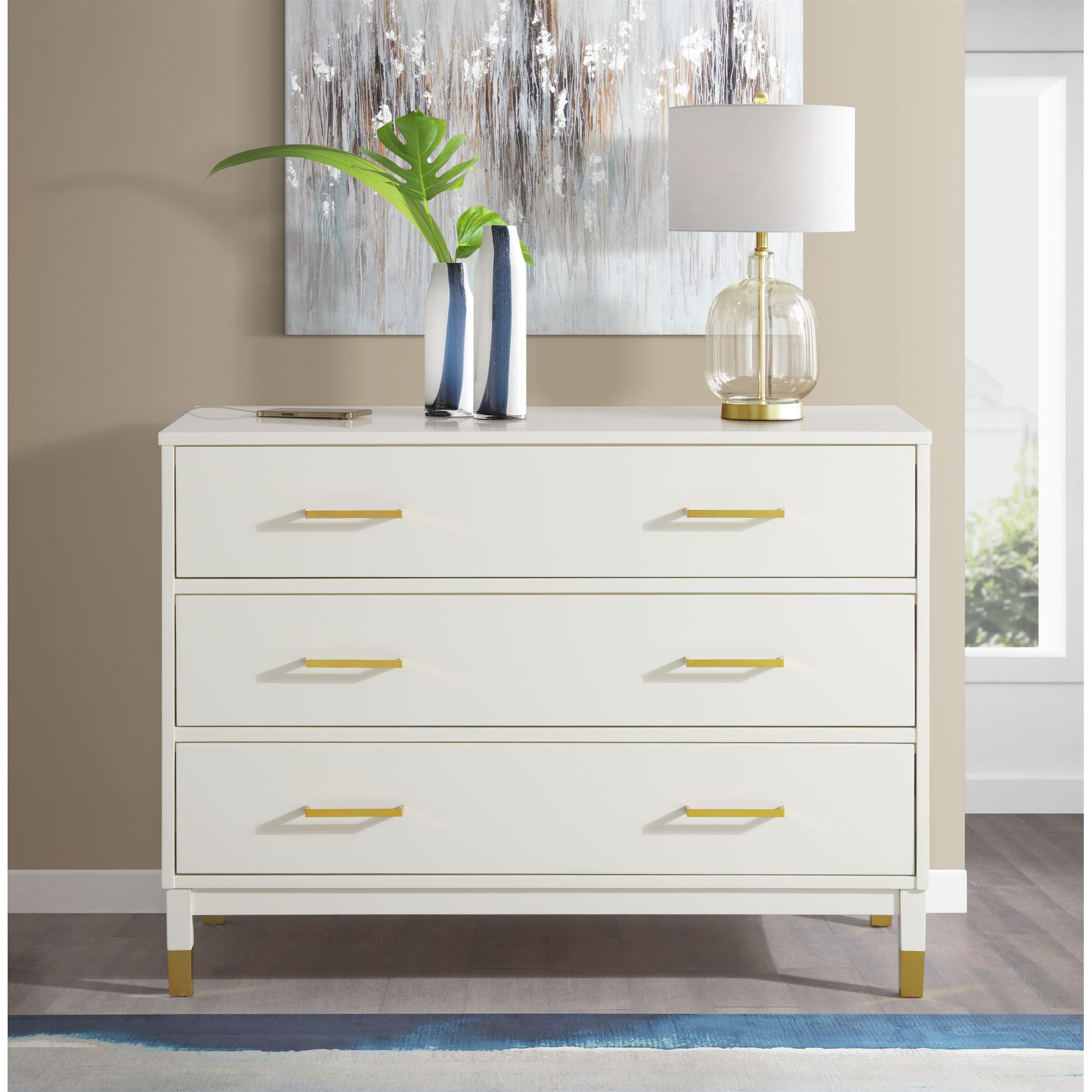 Simple is best with this chest piece that provides your room with a refreshing contemporary style. Choose from four easy-to-pair color finishes that are each combined with beautiful gold hardware and feet. The back includes one USB port and outlet, allowing you to always have quick access to power and does not limit to the possibilities of placement. Three spacious drawers with built-in stoppers make this chest an all-around statement piece for your style and storage needs. 1 Year Limited Manufacturer Warranty