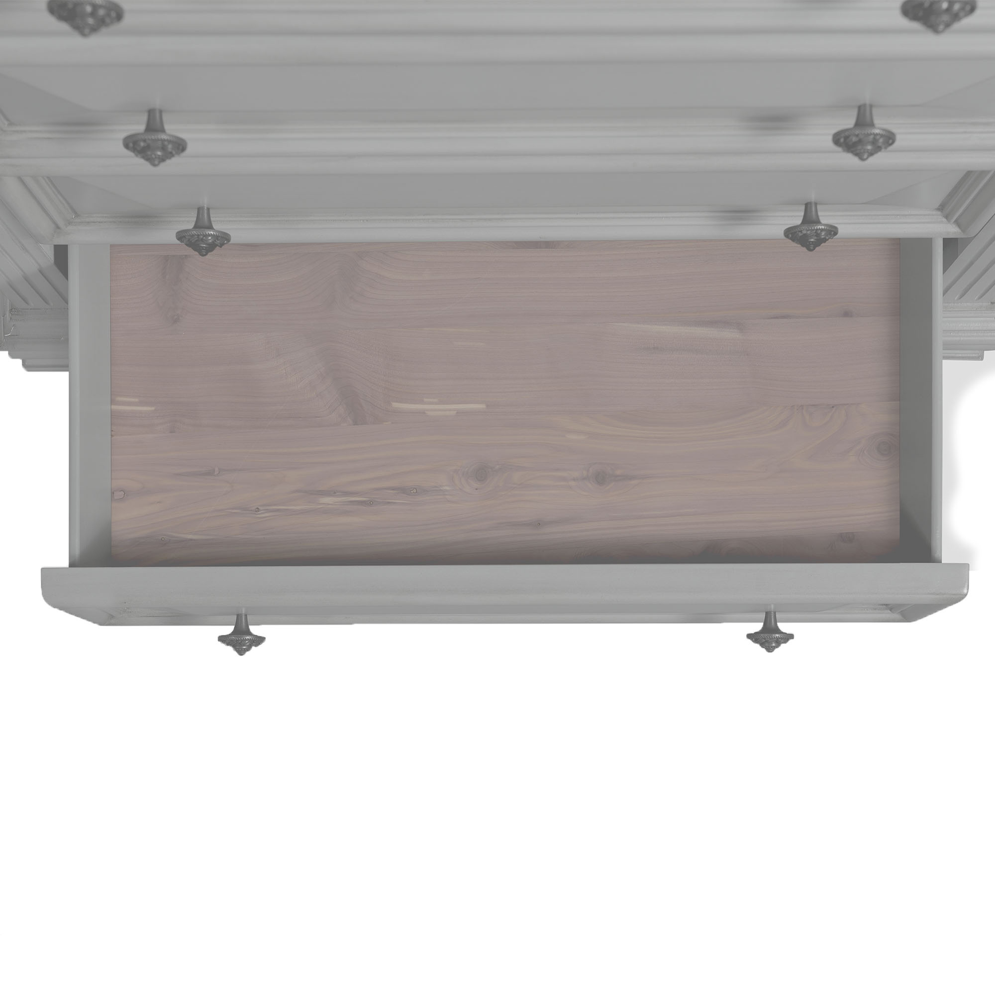 The Calloway 6-Drawer Chest is the perfect addition to your bedroom! This vertical chest comes with six, spacious drawers, more than enough storage space to store away your belongings. The two top drawers are felt lined, protecting your more delicate belongings. The bottom drawers are cedar lined and feature a dust proofing layer to help protect your clothes. Raised drawer fronts add an extra element of design to this already stunning set. The dark metal finish hardware pairs perfectly with the antique grey finish, making this transitional group a staple in your home for years to come. 1 Year Limited Manufacturer Warranty