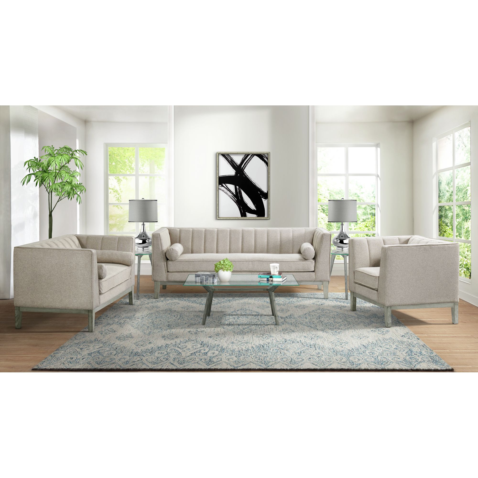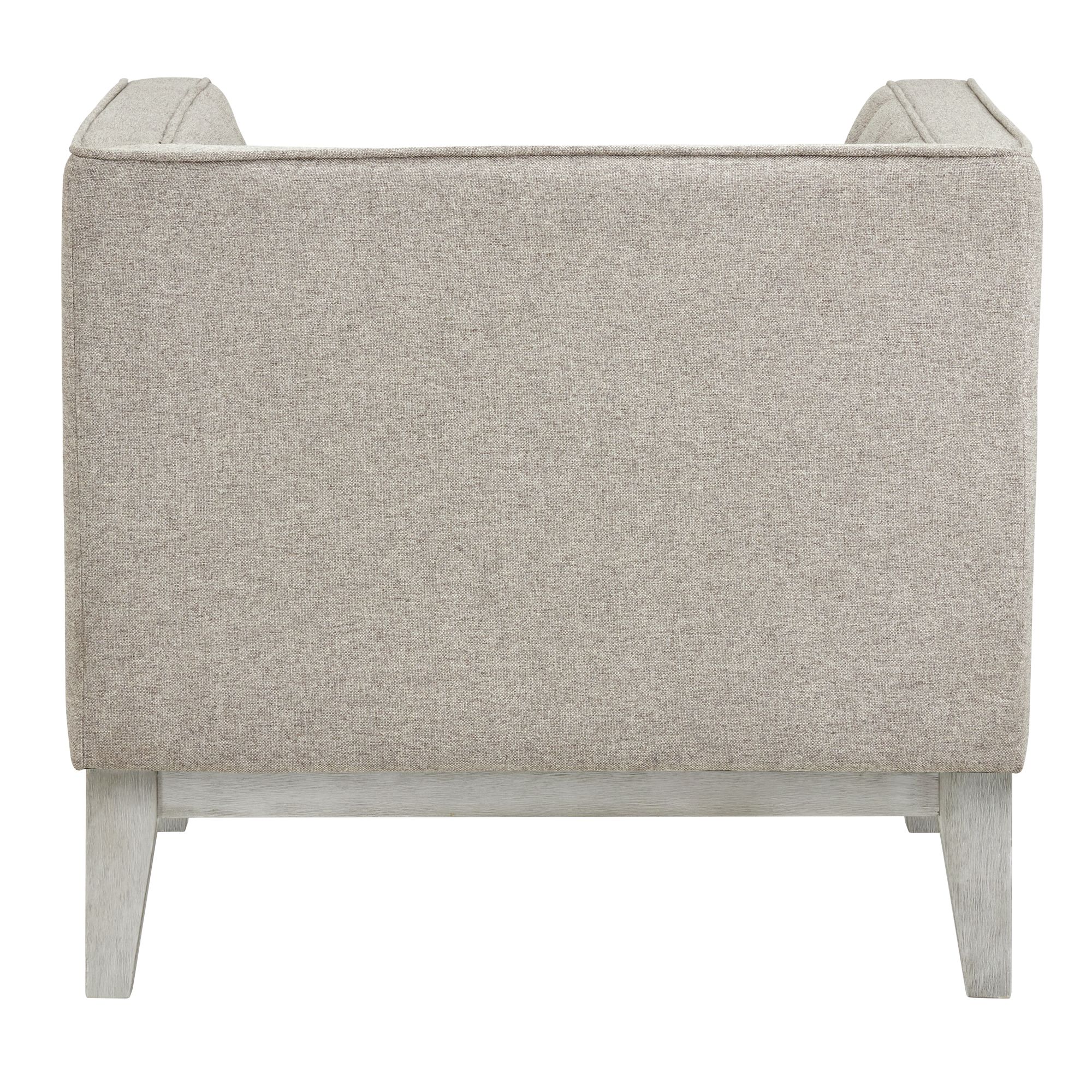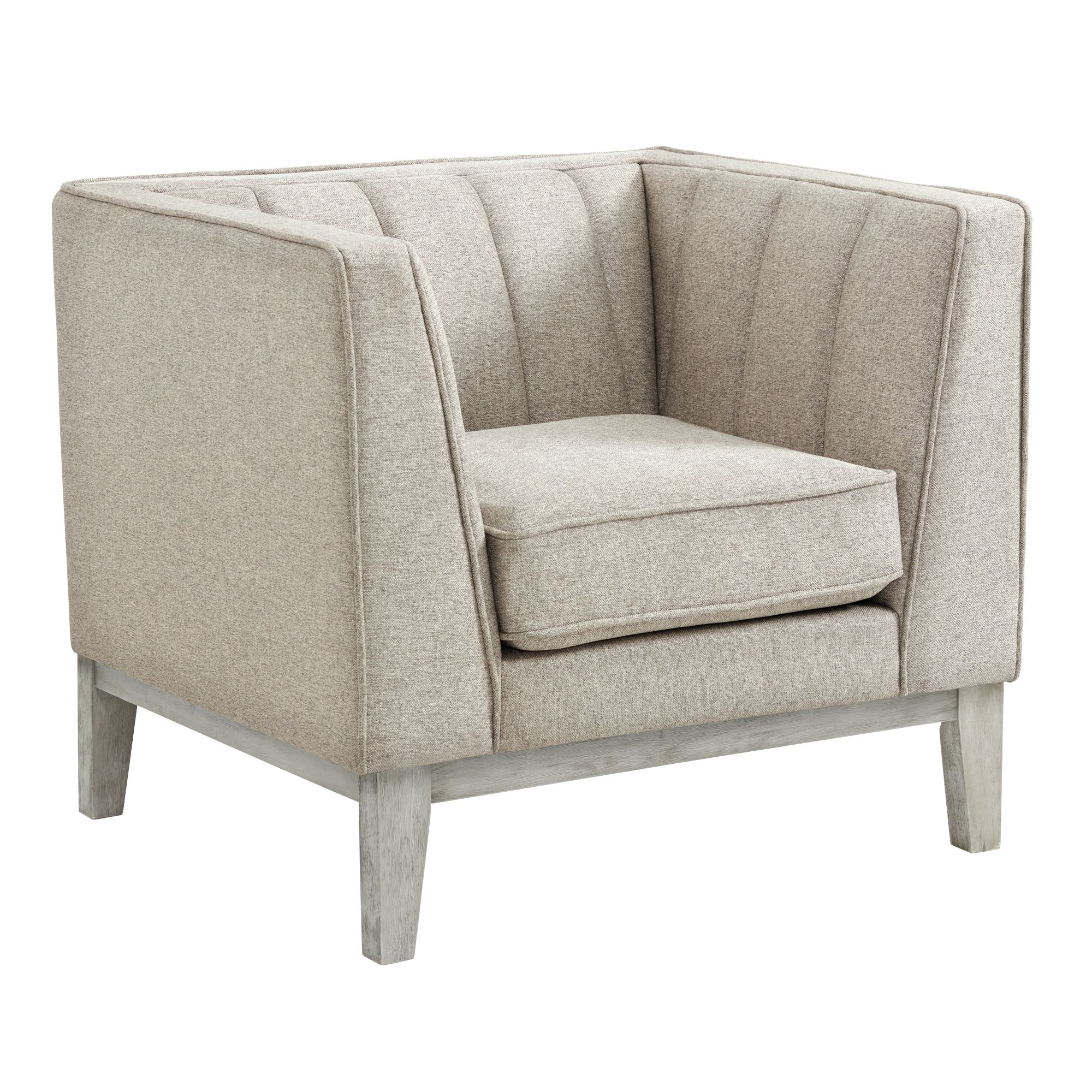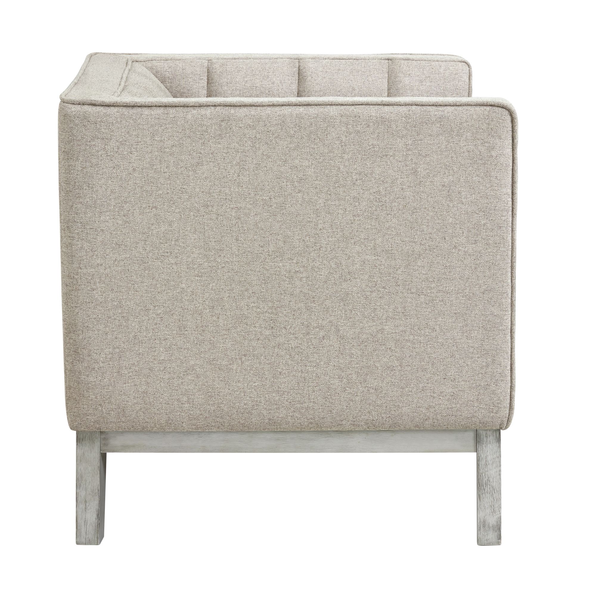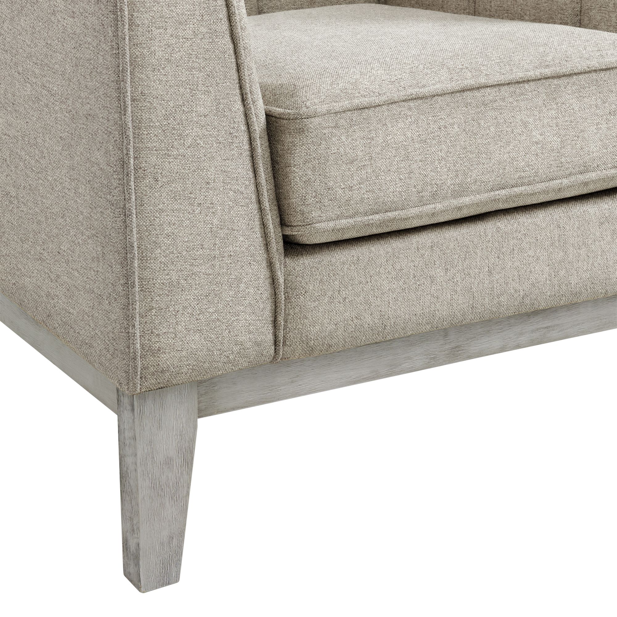 Cannes Accent Chair provides timeless style and comfort. Constructed of solid and manufactured woods and enveloped in soft, polyester all over with plush foam cushioning. Showcases a channel tufted back with clean-lined tuxedo arms. Includes two bolster pillows that easily accentuates the sofa. Finished with wood trim along the base with distressed wood legs. Accommodates up to 300 lbs and requires light assembly. This sofa will upgrade the space of any living room. Pair with the Cannes loveseat for a coordinated look. 1 Year Limited Manufacturer Warranty