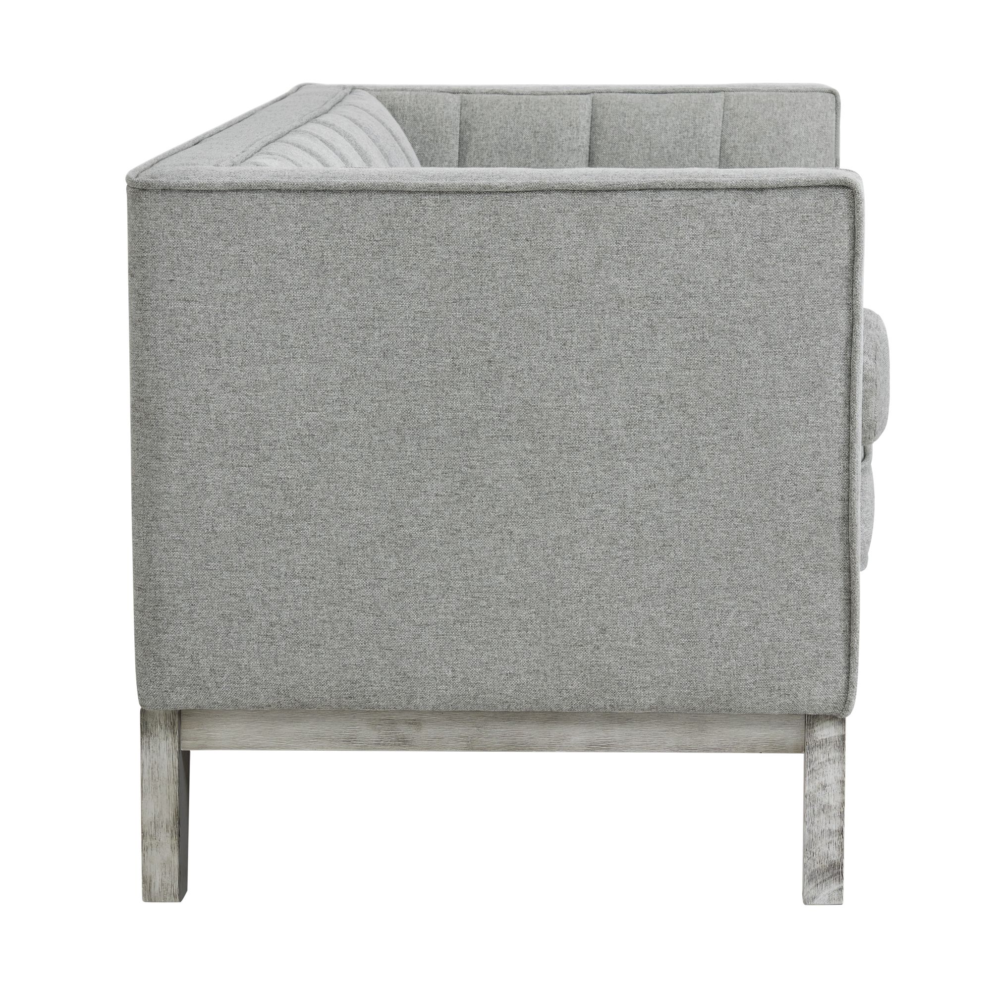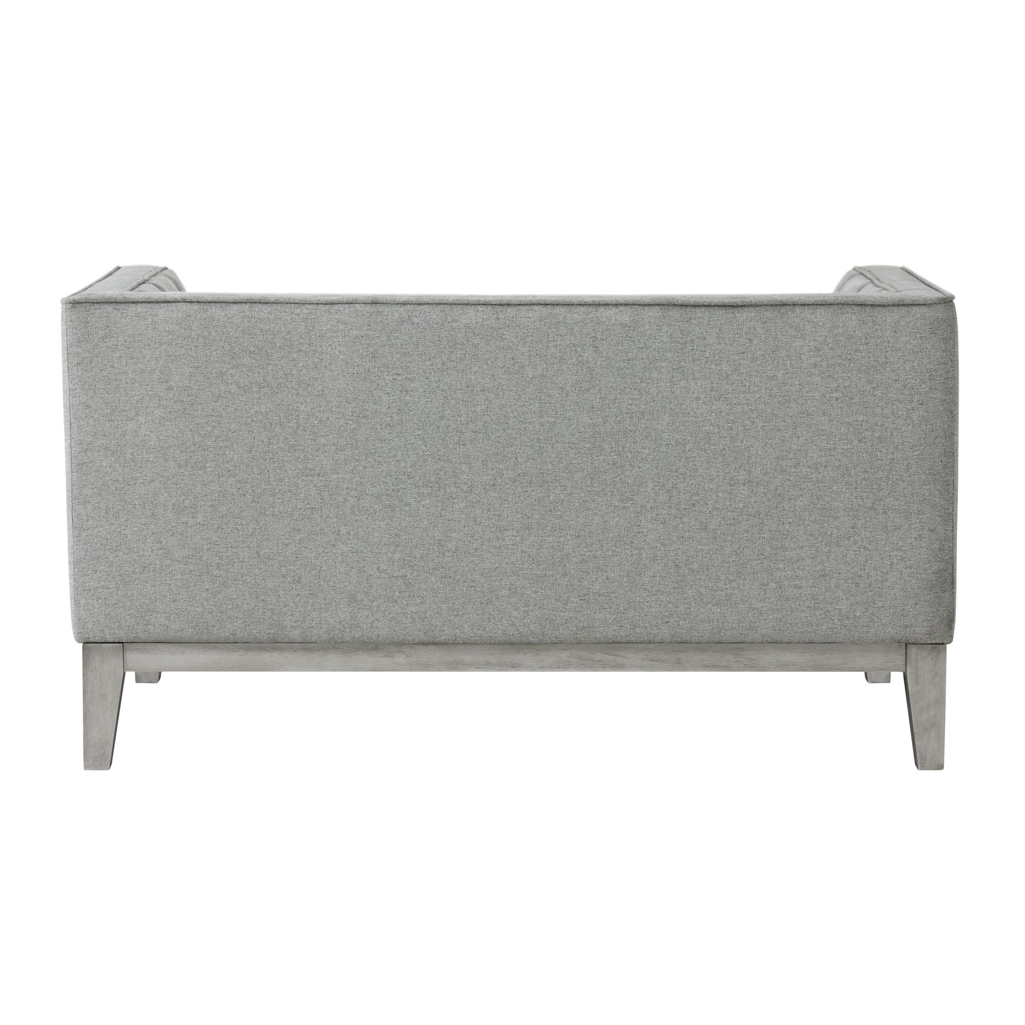 Cannes loveseat provides timeless style and comfort. Constructed of solid and manufactured woods and enveloped in soft, polyester all over with plush foam cushioning. Showcases a channel tufted back with clean-lined tuxedo arms. Includes two bolster pillows that easily accentuates the sofa. Finished with wood trim along the base with distressed wood legs. Seats up to two people with a weight capacity of 600 lbs. This loveseat will upgrade the space of any living room. Pair with the Cannes accent chair for a coordinated look. 1 Year Limited Manufacturer Warranty