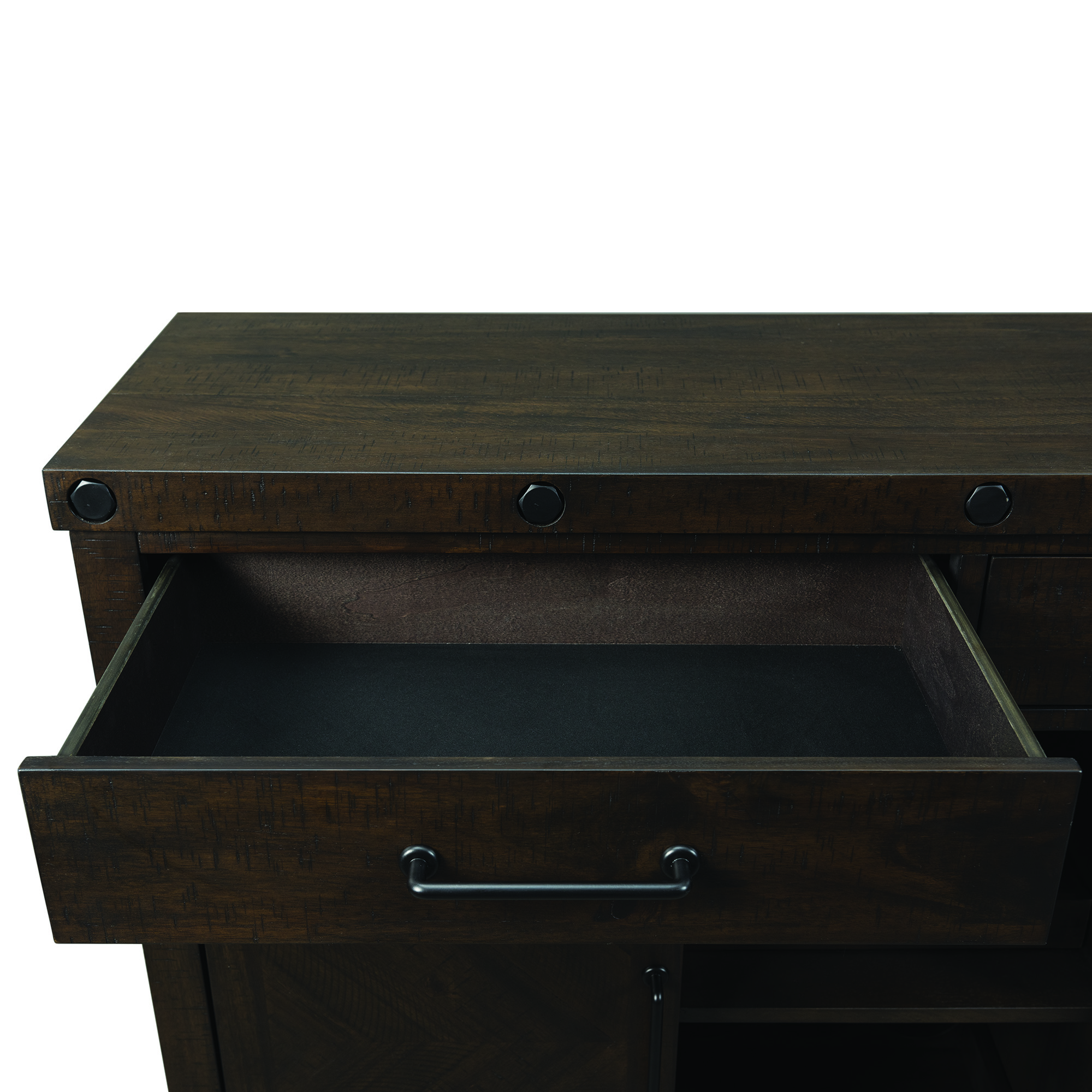 The Colorado dining collection, brings boldness to a casual dining scheme. With a trestle base design and a deep finish, this everyday counter height table serves as a perfect gathering space. Enjoy an attractive chevron design on its table top while accommodating deep chairs and extra storage. The inventive table design creates options for positioning to suite your needs. The slat back design of the chair and the black hardware finishes, reflect a design-forward blend of modern and farmhouse concept. 1 Year Limited Manufacturer Warranty