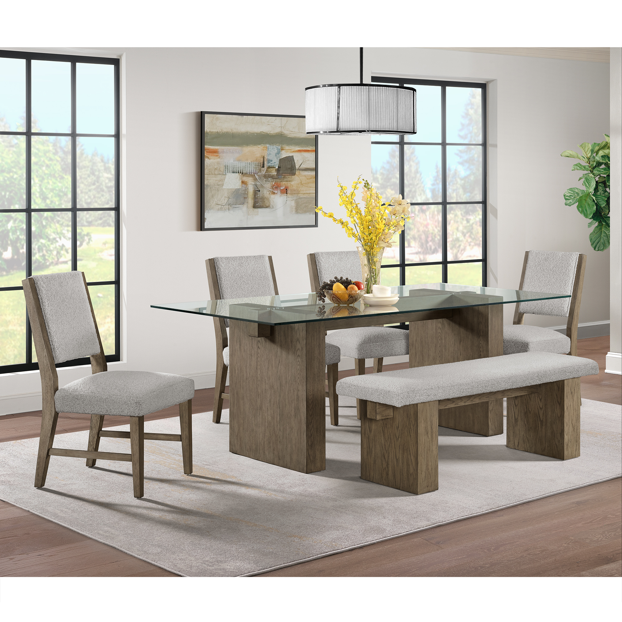 Elevate your dining space with the Conner 6PC Dining Set. Crafted with a natural oak finish, this set includes a spacious table, four chairs, and a bench, perfect for intimate or larger gatherings. The table boasts a durable construction of rubberwood and MDF with oak veneer, topped with 12mm tempered glass for a touch of contemporary elegance. Supported by a double pedestal base, it ensures sturdiness for years to come. The chairs feature foam cushioned upholstered seats and backs for ultimate comfort, with stretchers for added stability. Embrace the natural variations in wood and color, adding character to your dining area. 1 Year Limited Manufacturer Warranty