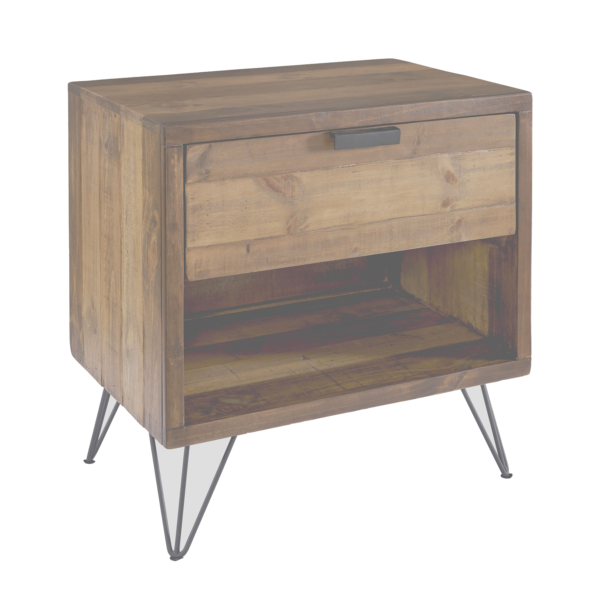 The Cruz bedroom collection, will instantly update any bedroom from stale to sustainable comfort. The warm finished pine wood provides a sense of rustic flair and modern variety with black accent hardware. This collection imparts sophistication to naturalist style with its angled legs and slat headboard. Crafted from reclaimed pine, it shows the knots and natural imperfections that make each piece subtly unique. 1 Year Limited Manufacturer Warranty