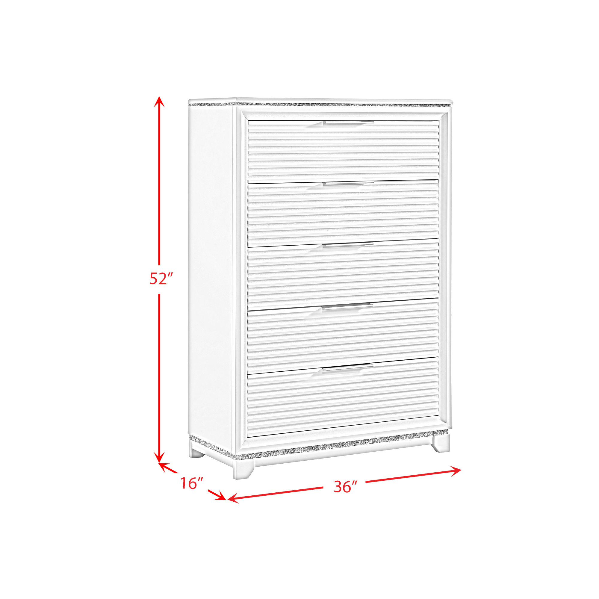 Sleek sophistication meets modern elegance with the Denmark 5-Drawer Chest. With its radiant white finish and textured drawer fronts, this piece transforms your bedroom into a sanctuary of style and grace. Subtle glittering accents along the perimeters add a touch of glamour, while spacious drawers provide ample storage for your cherished belongings. Its grand height makes this piece a stunning statement. Each drawer has sheeny metal handles and ball bearing glides, offering both beauty and functionality. The skillfully designed Denmark Chest brings an air of refinement and light, making your space feel luxurious and inviting. 1 Year Limited Manufacturer Warranty