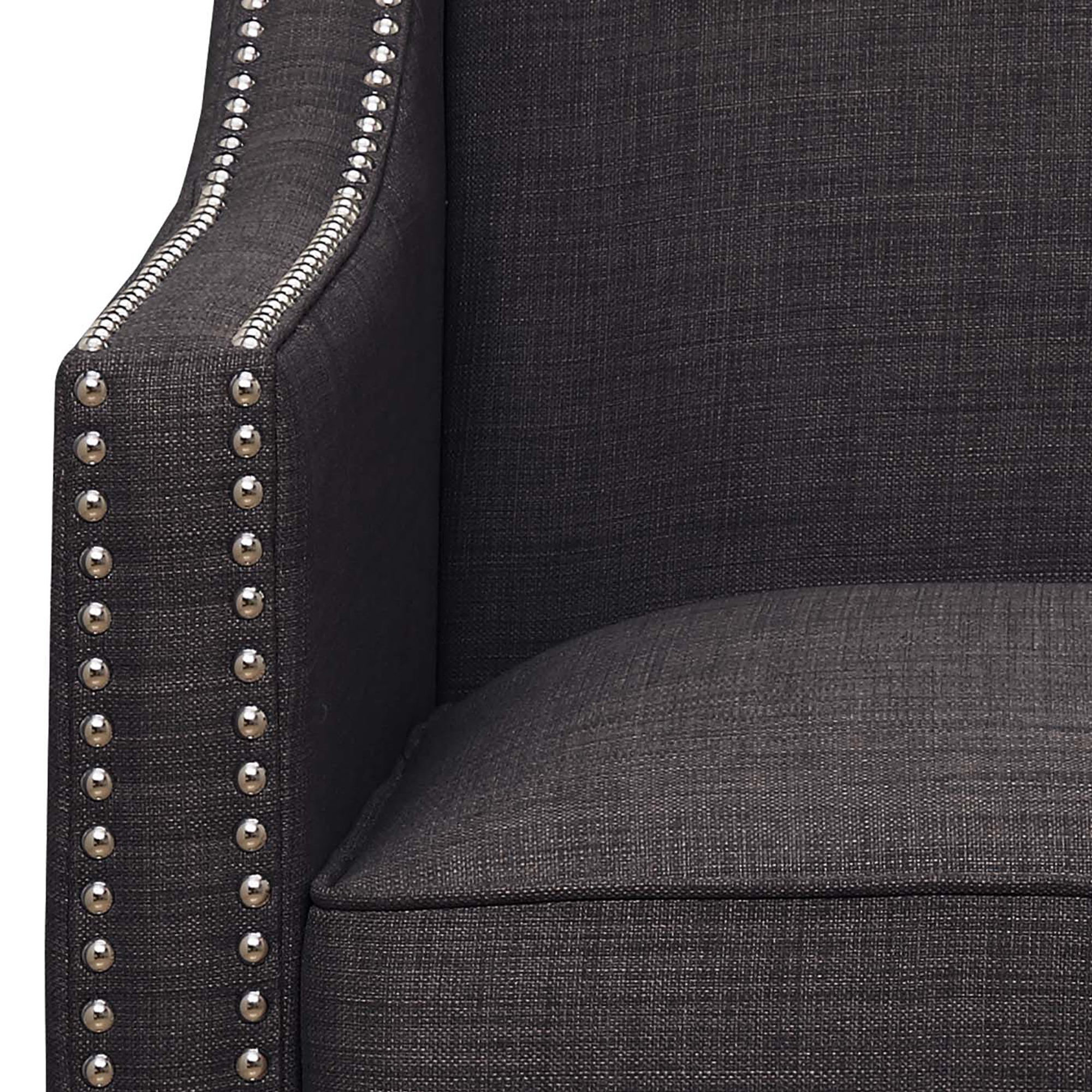 The Erica Chair boasts a refreshing combination of contemporary design with a touch of vintage flare. Its clean lines, low back, and straight edge arms are accented by nail head trim and dressed in a fashionable charcoal fabric upholstery. 1 Year Limited Manufacturer Warranty