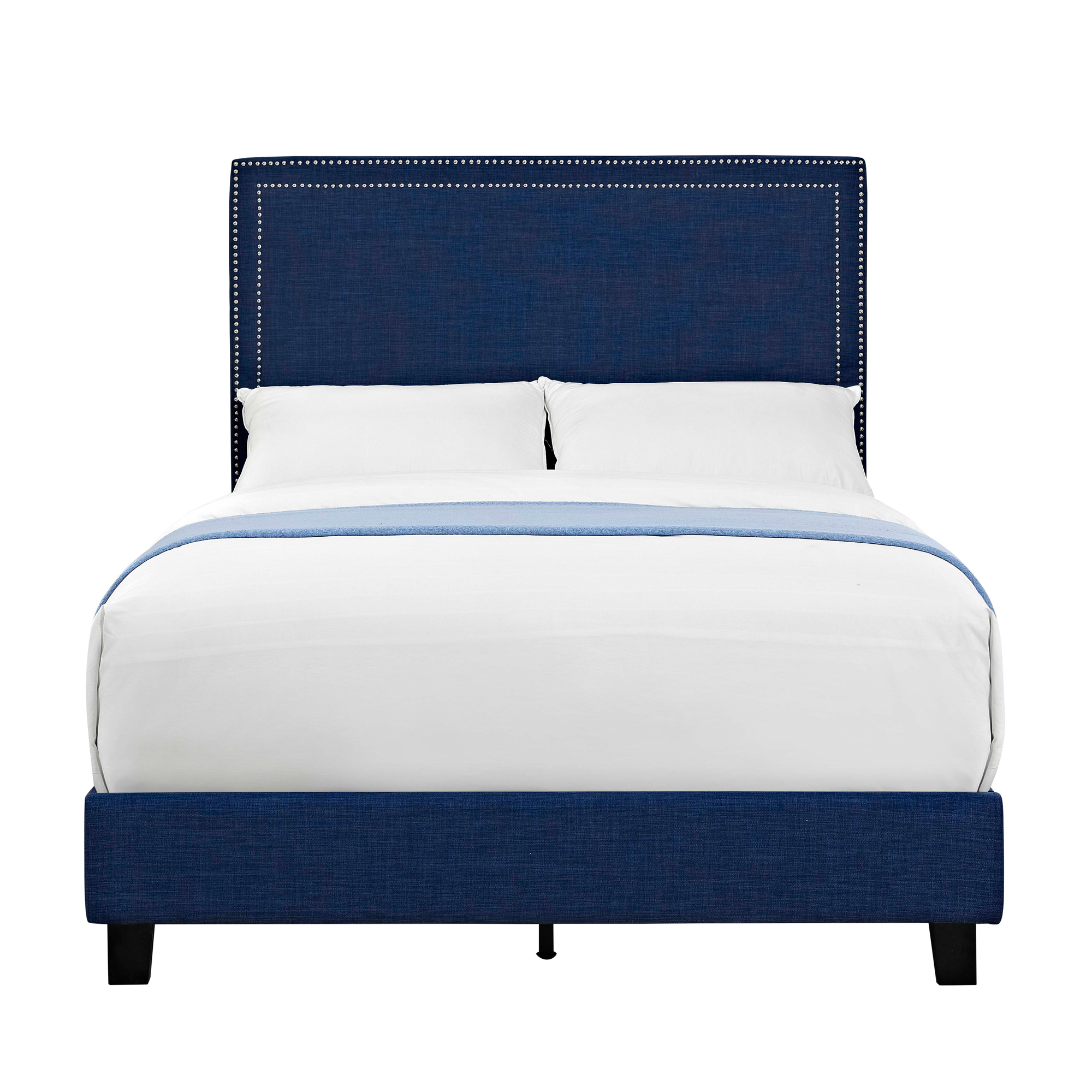Set the stage for a contemporary space with the Erica Bed. Its frame is crafted from manufactured wood with a striking streamlined silhouette. Polyester upholstery wraps the headboard and footboard for a crisp look, while a line of nailhead trim adds a touch of eye-catching appeal. This bed is the perfect transitional piece for any bedroom. 1 Year Limited Manufacturer Warranty