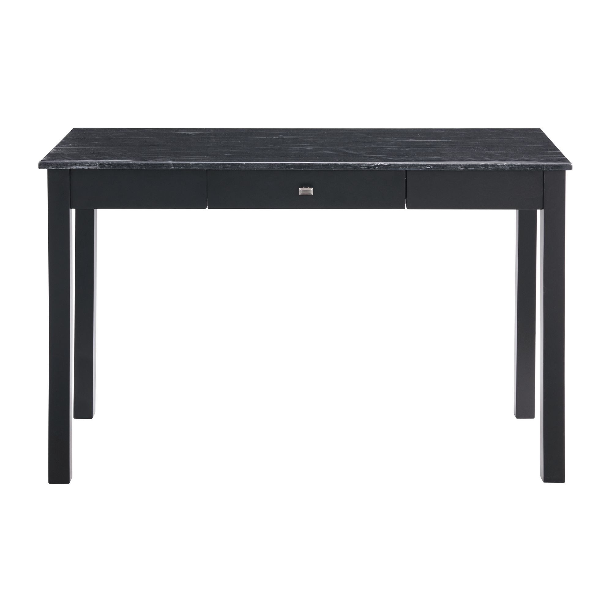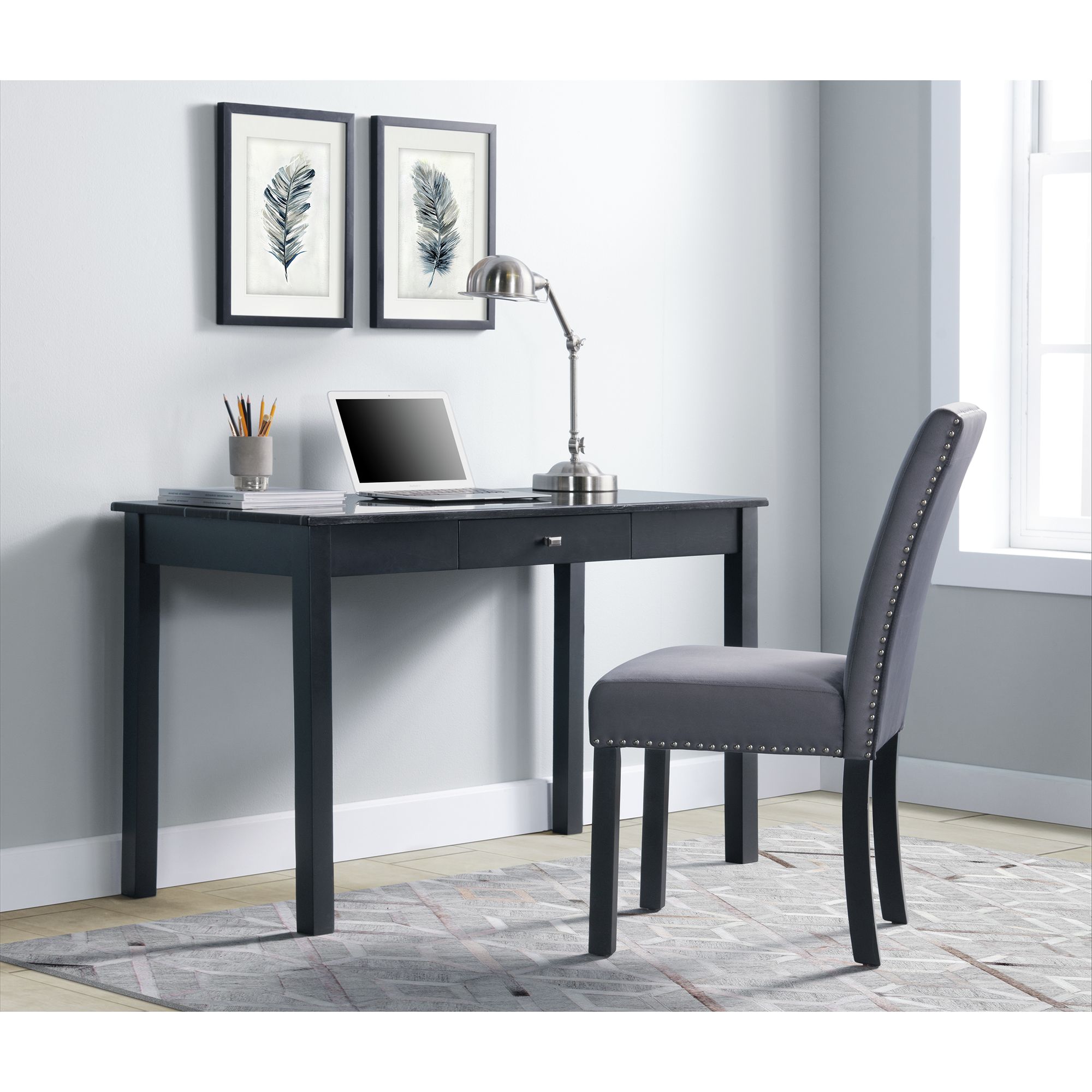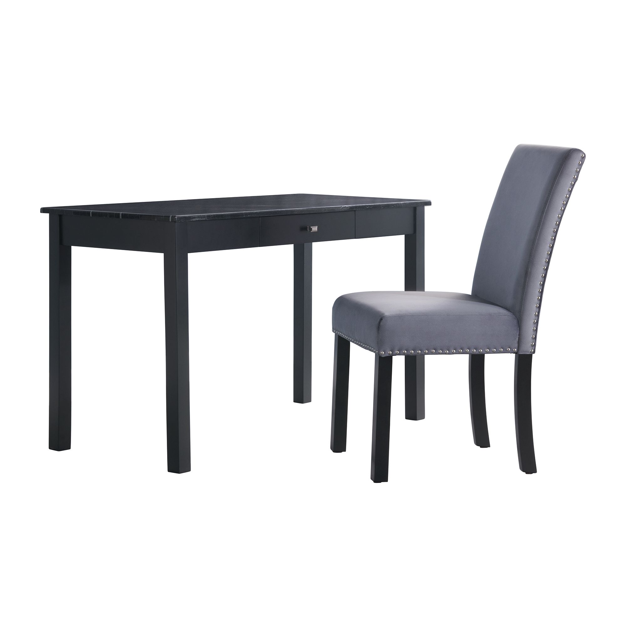 The Frank Desk and Chair set, fashioned with simplicity and immense functionality. This set includes a desk and chair. The desk is made with a faux marble table top and sturdy black legs. The chair is fully upholstered in soft polyester. The desk includes two usb outlets and a plug, so you can always keep your devices charged. One spacious drawer is featured at center for storing all of your office essentials. Perfect set for contemporary and modern homes. This desk and chair set ships in one easy to handle box! 1 Year Limited Manufacturer Warranty