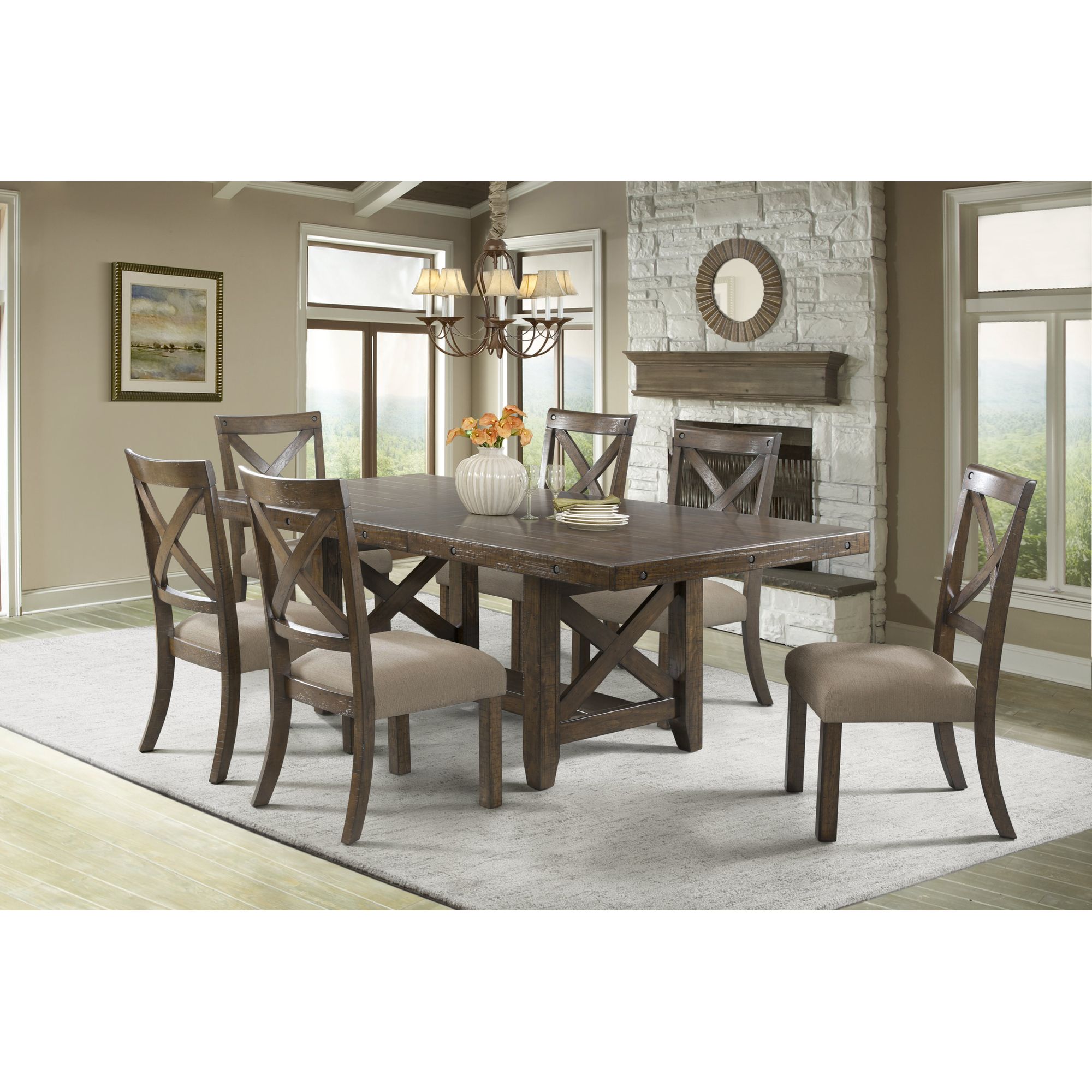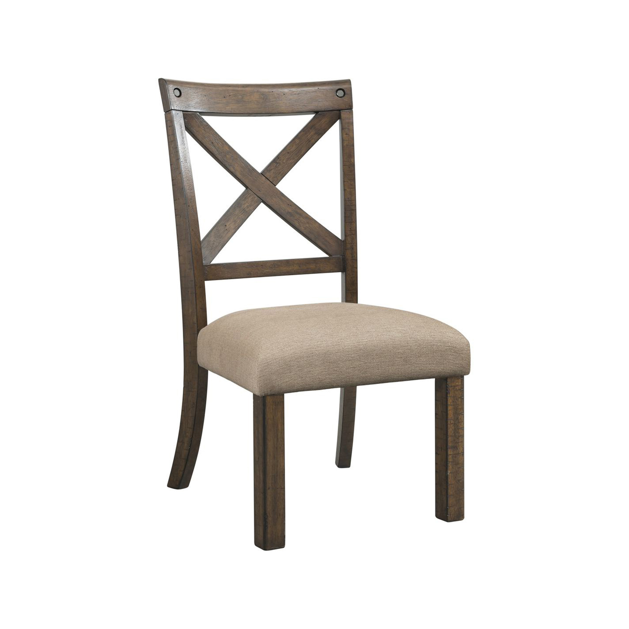 The Franklin Wooden Side Chair Set is a perfect addition to your dining table. This set includes two armless, wooden x back side chairs. The chairs uniquely feature, a deep distressed chestnut finish and decorative hexagonal nail heads in the chair back. The dark taupe linen, upholstered fabric provides a comfortable dining experienece. The back of the chairs are designed to match the trestles of the table with the same cross panel. Make it a complete dining experience by getting the dining table and coordinating upholstered bench 1 Year Limited Manufacturer Warranty