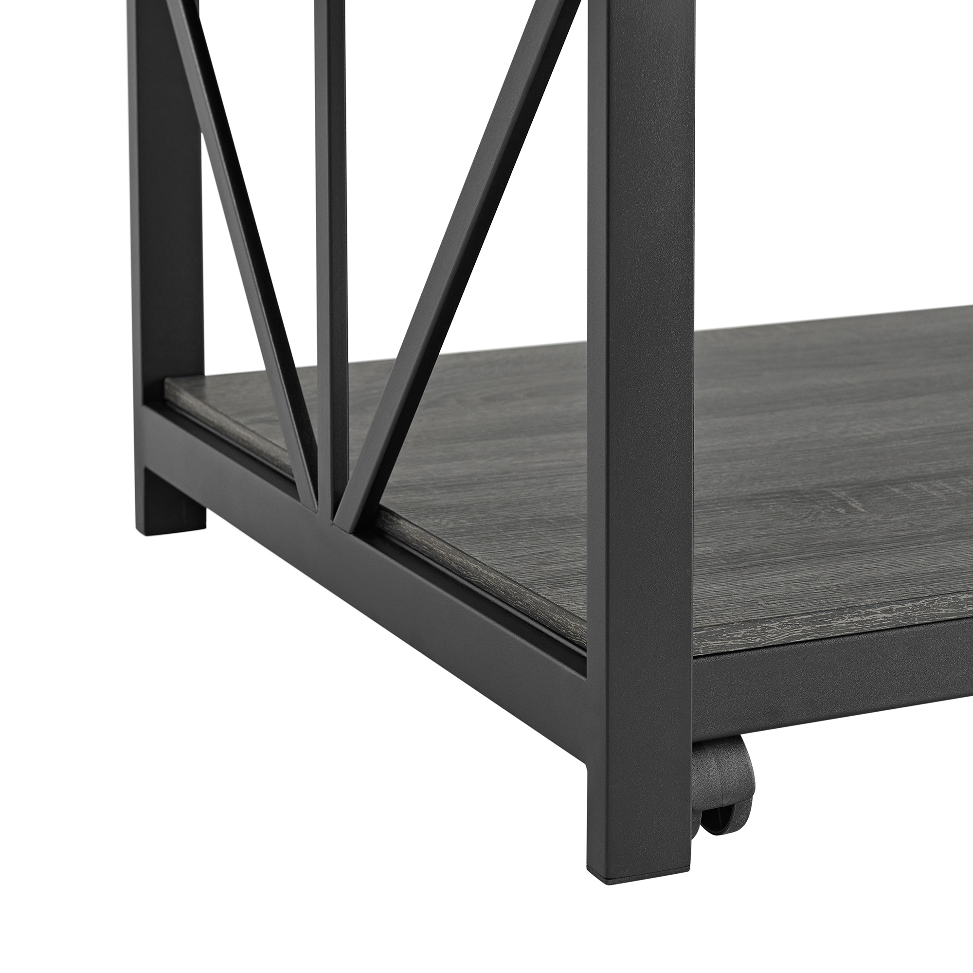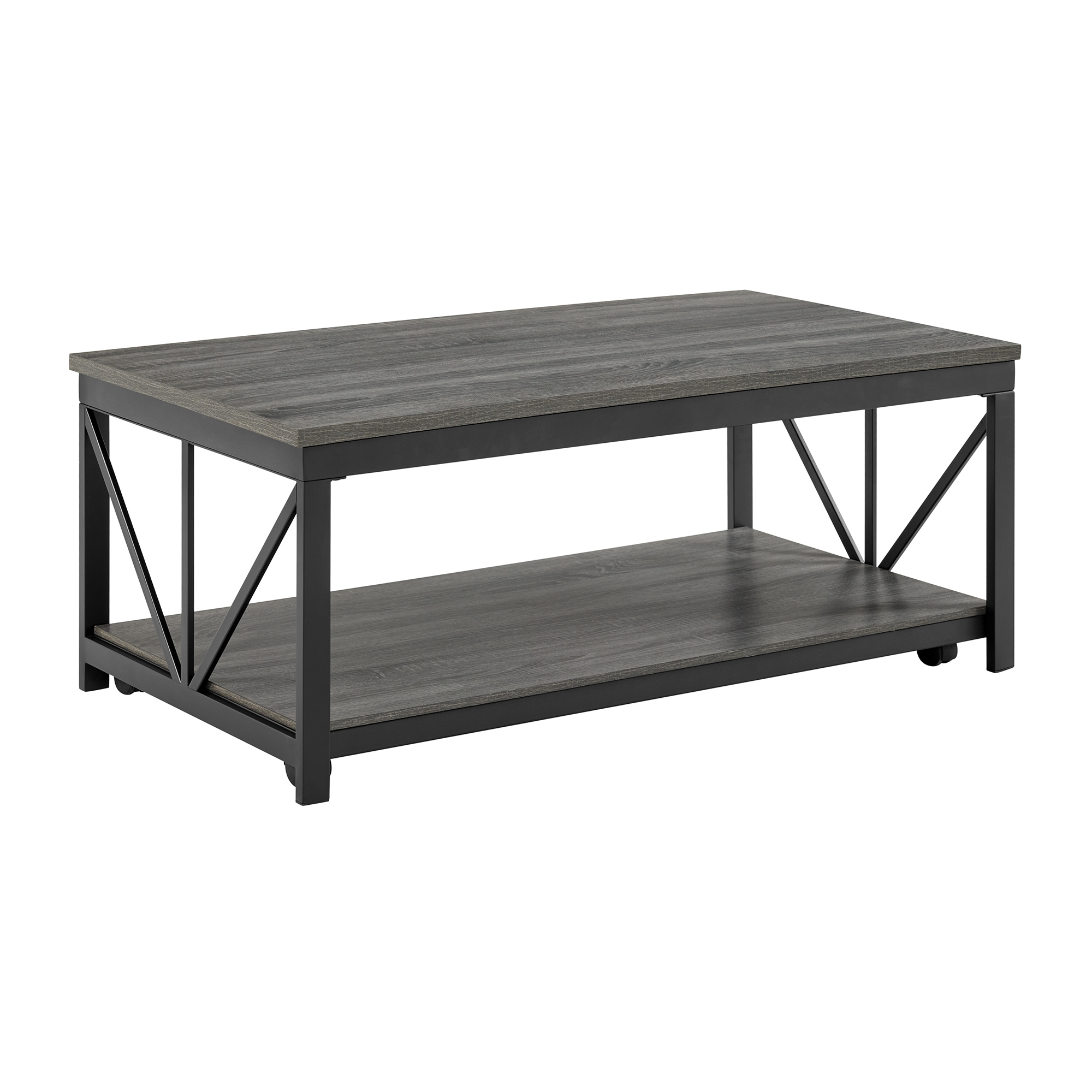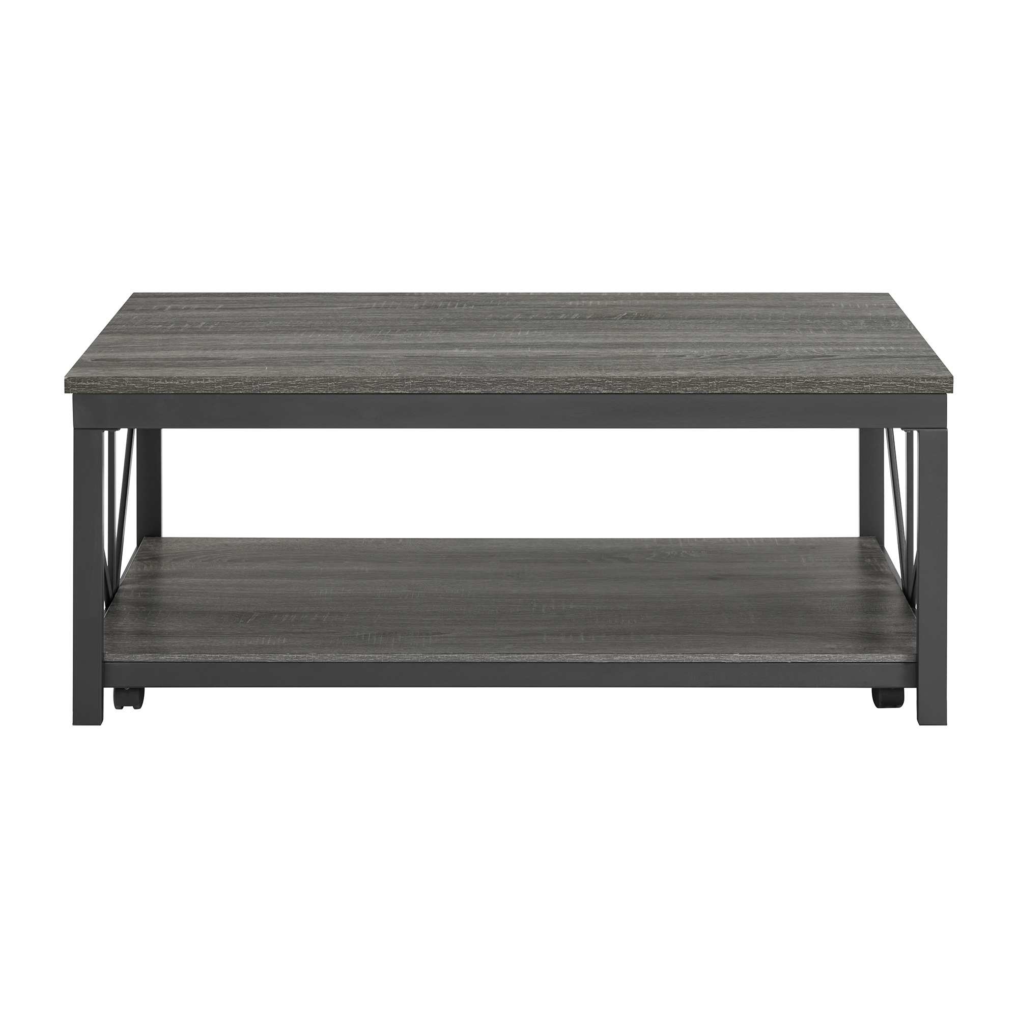 Introducing the Gemma Lift Top Coffee Table, a stylish addition to any living room with its industrial design and sleek black metal base. The table features a sophisticated grey wood finish, adding a touch of elegance to your space. With its convenient lift top functionality, it provides extra storage and can also be used as a work or dining surface. The open bottom shelves offer additional display or storage options. Equipped with casters, the Gemma Coffee Table is easy to move around and perfect for modern homes. 1 Year Limited Manufacturer Warranty