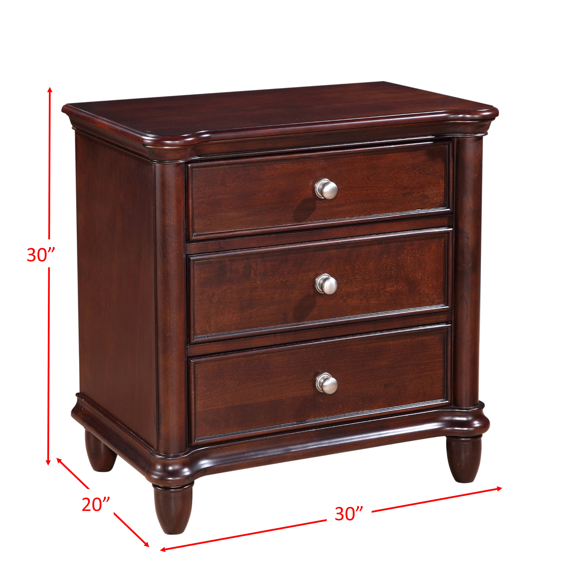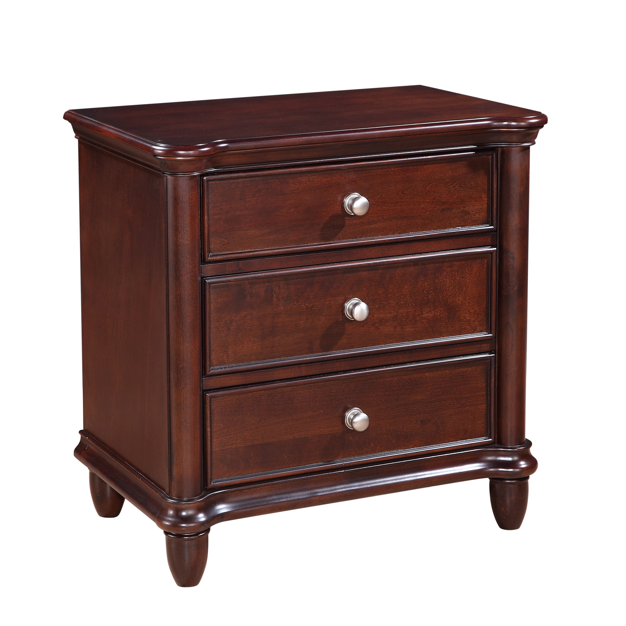 The Hamilton 3-Drawer Nightstand is the perfect bedside table to complete your bedroom! This nightstand comes with three, spacious drawers, perfect for storing away all of your bedside necessities. The bottom drawer has a dust proofing layer to help protect your belongings. This nightstand comes in a traditional, cherry finish making it a bedroom staple youll enjoy year after year. Bevel edges and tapered feet complete the look of this traditional design. 1 Year Limited Manufacturer Warranty