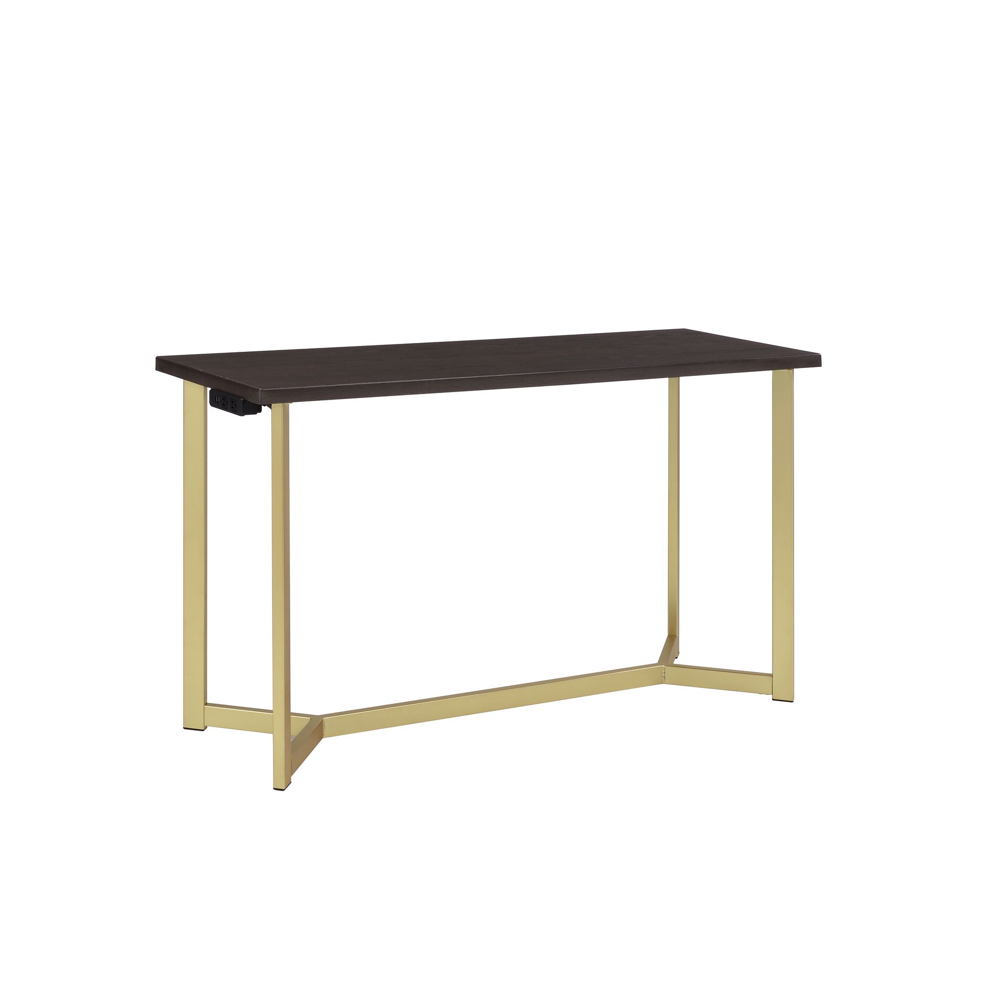 The Harper Multipurpose Bar Table Set will introduce modern style to your casual dining nook or entertainment area. The bar table features a sleek, gold metal base that pairs perfectly with the espresso finish top. This elegant bar table offers a sleek and functional design with its USB power capabilities. The stools also feature gold metal legs and is upholstered in brown polyester fabric with foam cushioning for extra comfort. This set is designed with small spaces in mind. Add this glamorous multipurpose bar table set to your home today for a look you'll never tire of. 1 Year Limited Manufacturer Warranty