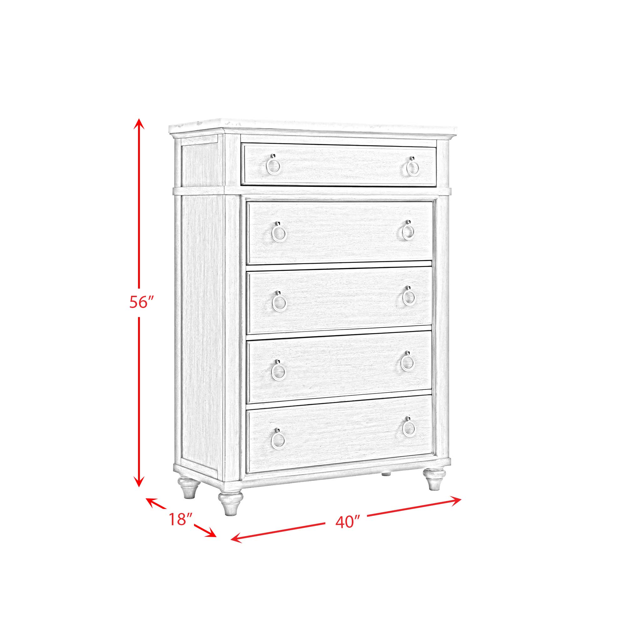 A charming traditional piece with a touch of modern—this chest features a light wood finish beautifully complemented with a sleek, white marble top. This piece includes a set of ring pulls on each of its five drawers. These provide spacious storage for you to place your personal belongings, making everything about this chest easy to love. 1 Year Limited Manufacturer Warranty