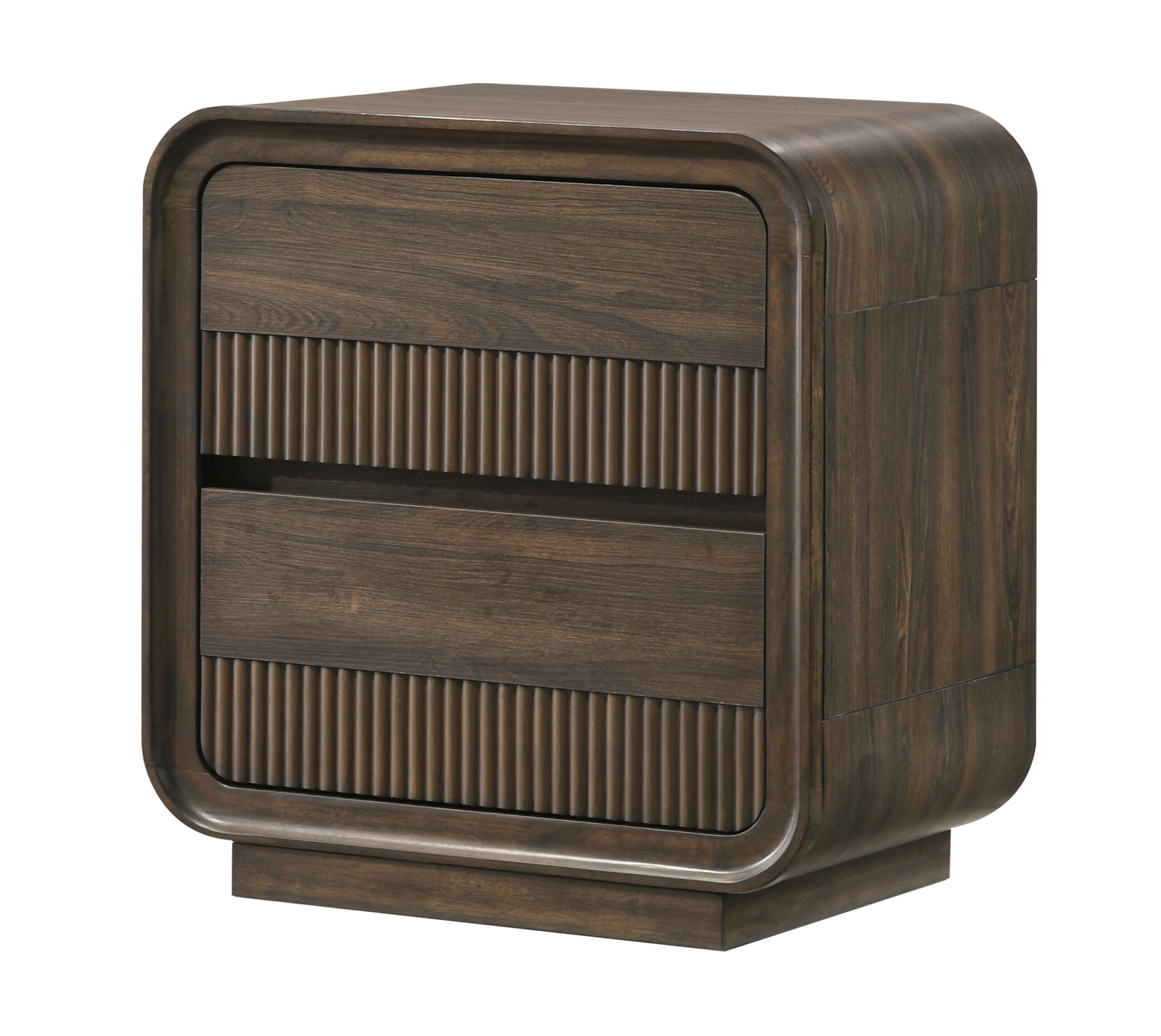 Elevate your bedroom with this stunning ensemble that seamlessly blends modern design with mid-century flair. Featuring sleek lines and a warm wood finish, this collection exudes understated elegance and sophistication. Each piece is crafted with precision, offering ample storage options that combine functionality with style. The rounded edges and stylish paneling create a harmonious look, adding unique character to your space. Transform your bedroom into a chic, inviting retreat where contemporary design meets timeless appeal, perfect for those who appreciate refined aesthetics and practical luxury.