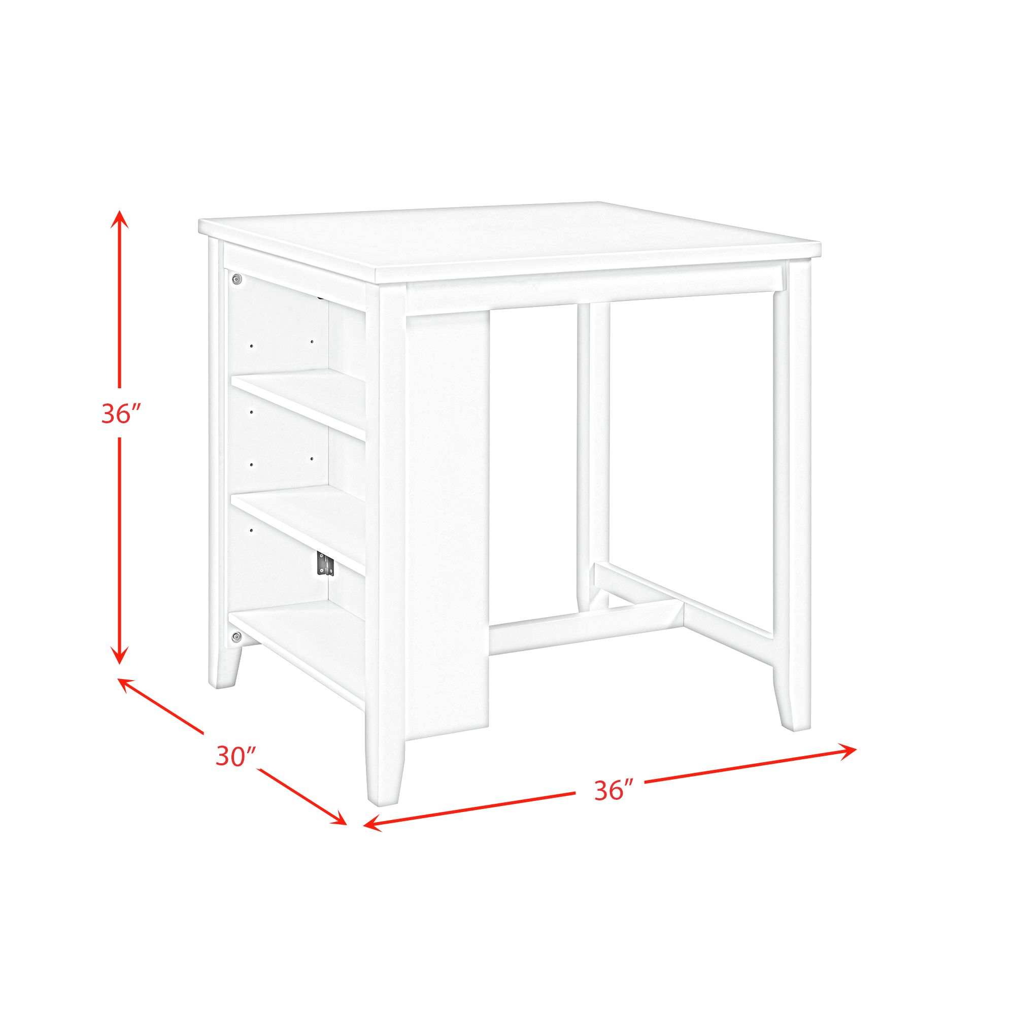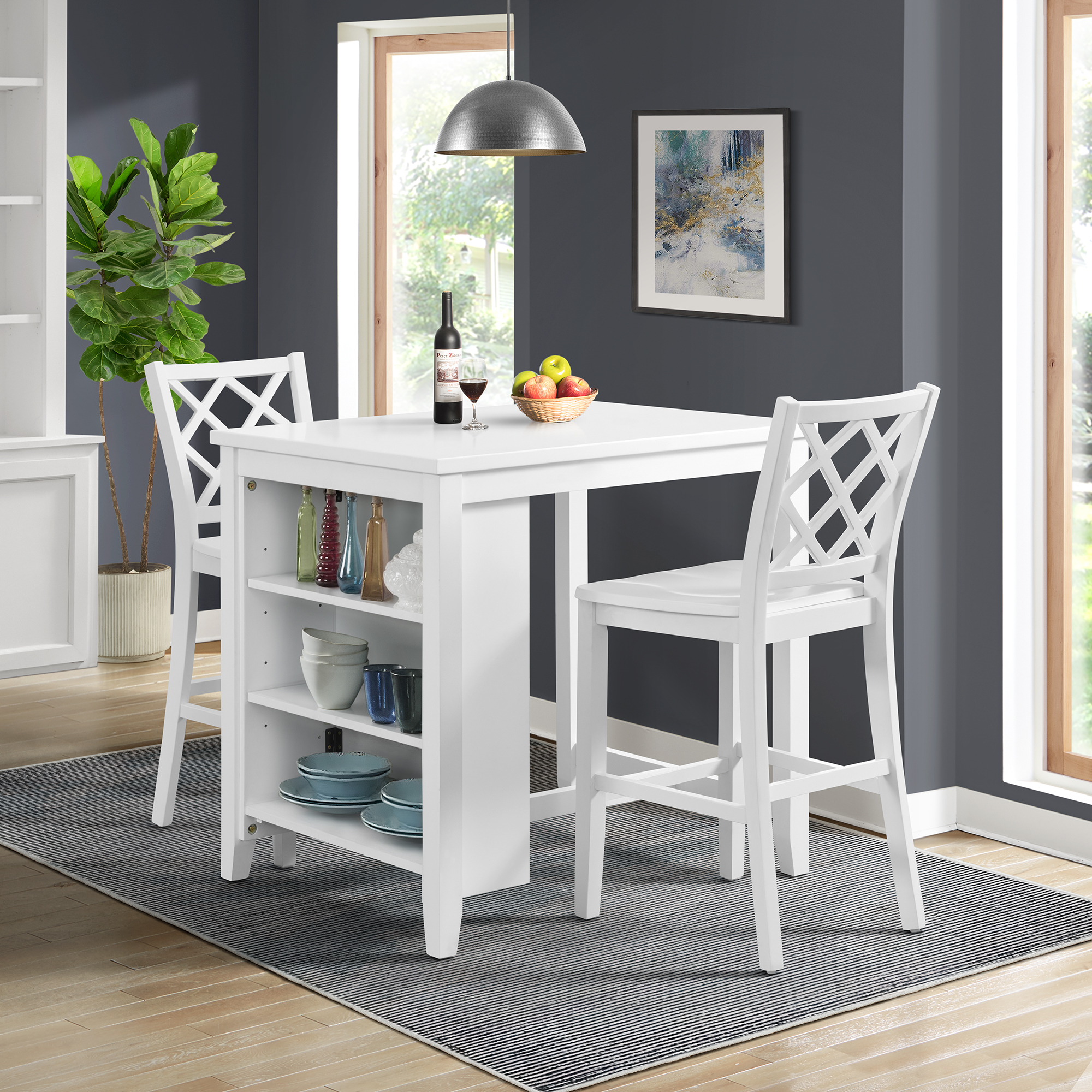The Kona 3PC Storage Counter Dining Set is the perfect addition to any dining space. This set includes a white table and two grey chairs, providing a spin on everything you need for a complete dining experience. The table features open shelving to easily store and display dining essentials. The lattice back chair design adds a touch of elegance and style. With leg stretchers and floor glides included, this dining set is built to last and withstand everyday wear and tear. This group offers space-saving capabilities, making it ideal for smaller spaces. Elevate your dining experience with the Kona Storage Counter Dining Set. 1 Year Limited Manufacturer Warranty
