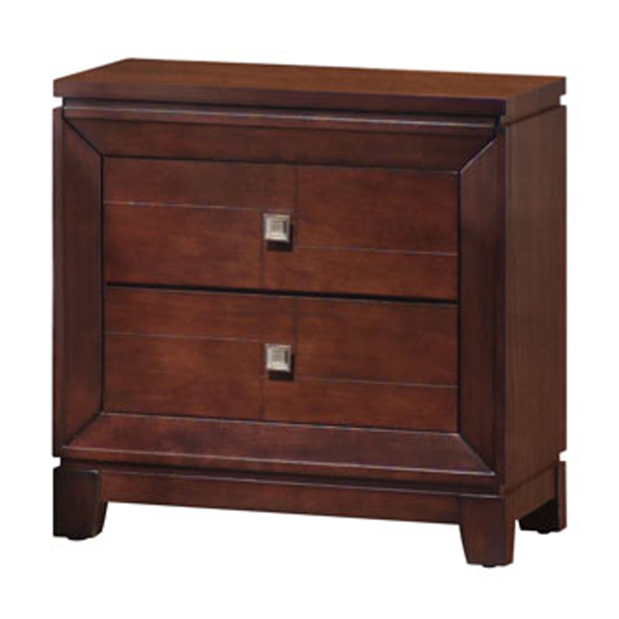 The London 2-Drawer Nightstand offers contemporary style complete with some hidden surprises! This nightstand comes with two full size drawers and a felt-lined top hidden drawer—perfect for storing away all of your valuables and bedside necessities. The bottom drawer features a dust proofing layer to help protect your belongings. Silver square drawer knobs add the finishing touch and complement the warm cherry color beautifully. 1 Year Limited Manufacturer Warranty