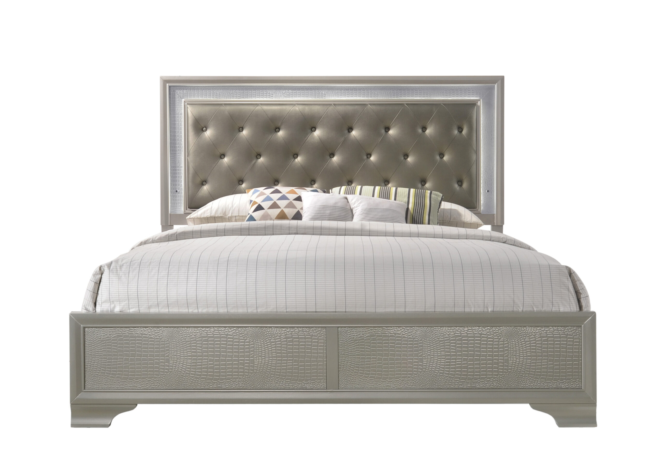 Step into a realm of sophistication and comfort with this stunning bedroom collection. Each piece showcases an exquisite blend of traditional charm and contemporary flair, making a bold statement with its textured surfaces and elegant champagne finish. The bed, a centerpiece of luxury, features a sumptuous, tufted headboard with integrated lighting that invites a touch of opulence to your restful retreat. Coordinating storage solutions, including a dresser, chest, and nightstand, offer ample space with their gracefully designed drawers, accented with shimmering hardware that complements the set’s chic aesthetic.