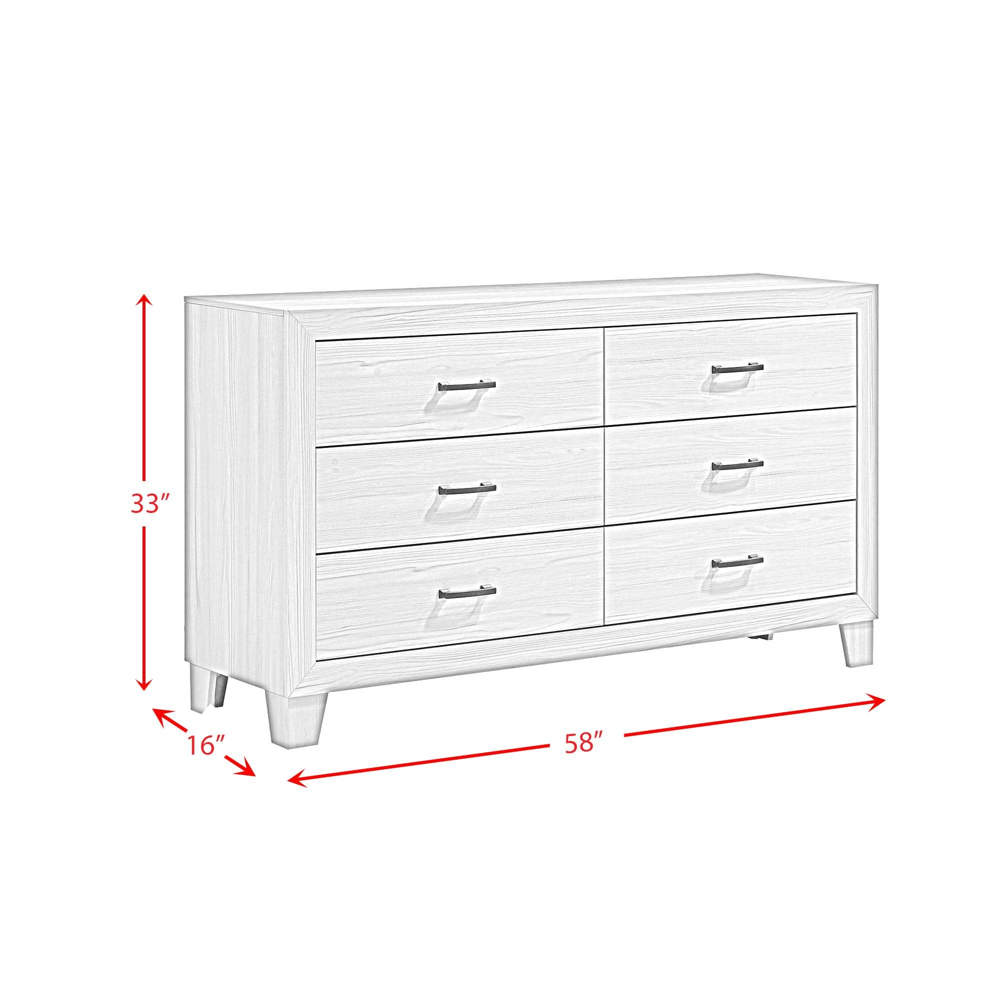 Makayla 6-Drawer Dresser in Gray is going to look great in your bedroom! This horizontal dresser comes with six spacious drawers that will easily store away your belongings, while the dust proofing layer on the bottom drawer helps protect those belongings. The black metal drawer handles pair perfectly with the light gray finish on the dresser, making this an easy piece to match up with existing interiors. Sleek, clean lines and a transitional design, this dresser is sure to be a staple in your home for years to come! 1 Year Limited Manufacturer Warranty
