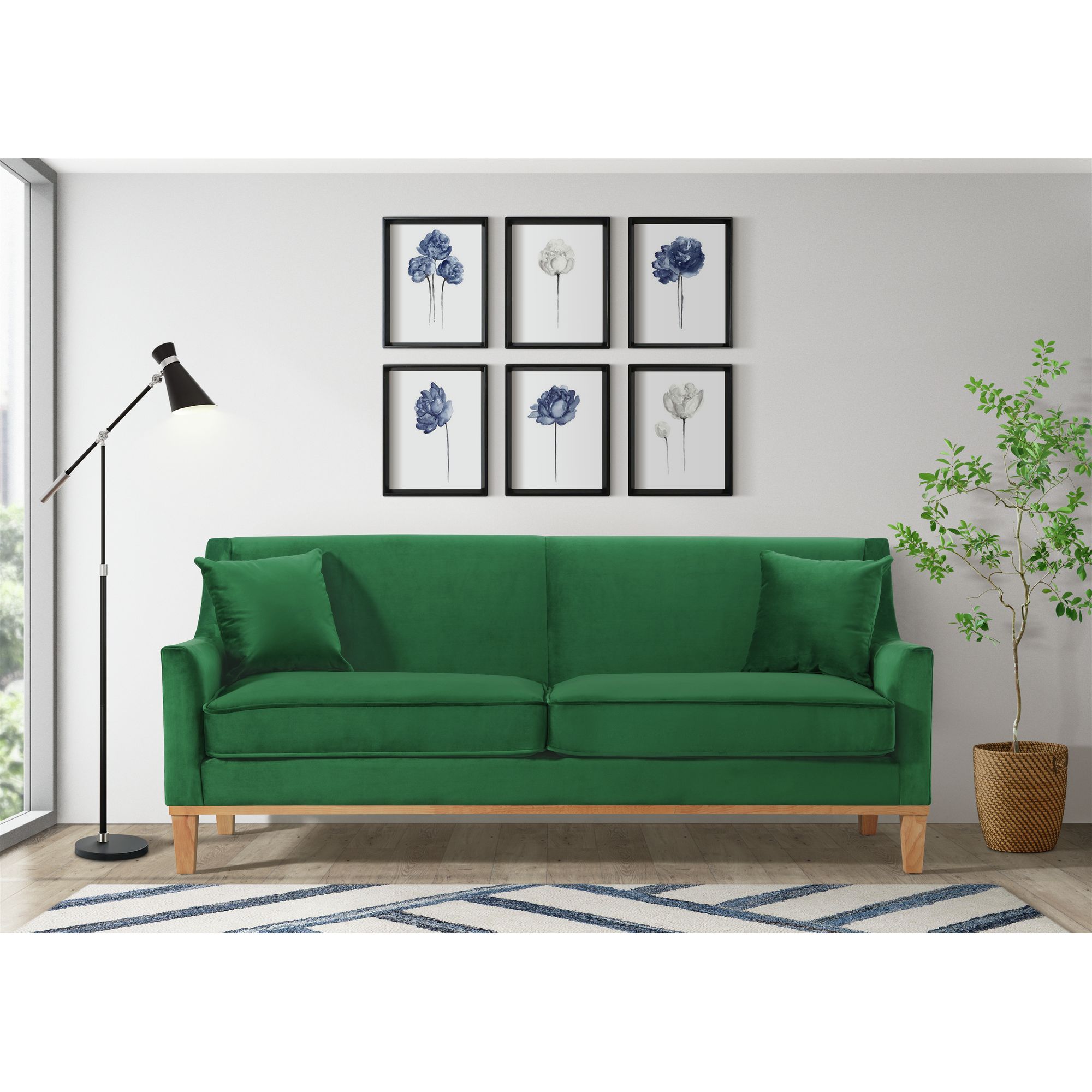 The Palmer Sofa will be your new favorite place to come home to. Includes two decorative pillows, track arms, and wooden legs, this sofa adds a warm feel to any space. Upholstered in lush velvet fabric and carefully constructed with pine and plywood frame and situated on top of distressed wooden base. The high density foam makes this sofa perfect for all day lounging with family and friends. Perfectly seats two-three people and can be paired with an ottoman or accent chair. 1 Year Limited Manufacturer Warranty