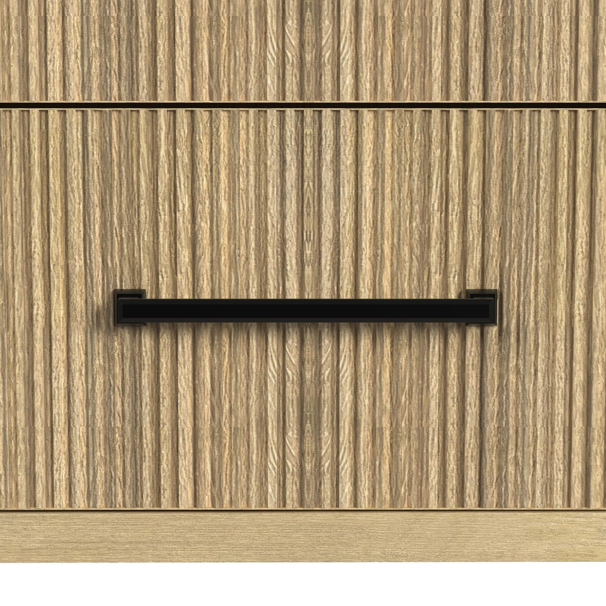 Enhance your bedside with the stylish Ridgemont Nightstand. Finished in a light wood with natural grain detailing, this piece brings warmth and elegance to any space. Sleek, rounded edges and vertical reeding throughout create a modern yet refined aesthetic. The nightstand features a convenient USB port, perfect for easy device charging, while the black felt-lined top drawer provides protection and organization for your essentials. Spacious drawers, accented with bold black bar pulls, offer ample storage. With clean, minimalist lines, the Ridgemont Nightstand combines function and contemporary design, making it an ideal addition to your bedroom. 1 Year Limited Manufacturer Warranty