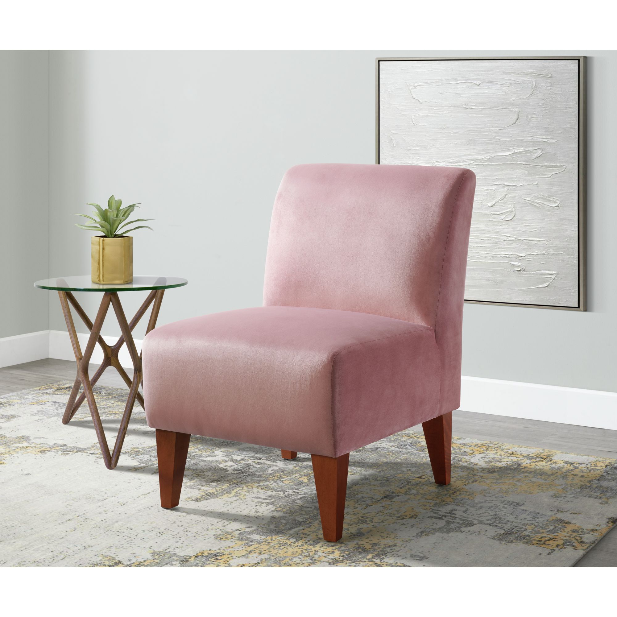 The Scarlett Accent Slipper Chair is a charming slipper chair covered with a stylish fabric upholstery. Its chic armless design sits low to the ground making it the perfect complement to a dressing room or any seating area in your home. The soft, velvet fabric gives you a modern glam look that will instantly make your space feel chic. From neutral to vibrant, this chair comes in different colors to fit any personality. Add this accent chair to your home today for a look that you will love to come home to. 1 Year Limited Manufacturer Warranty