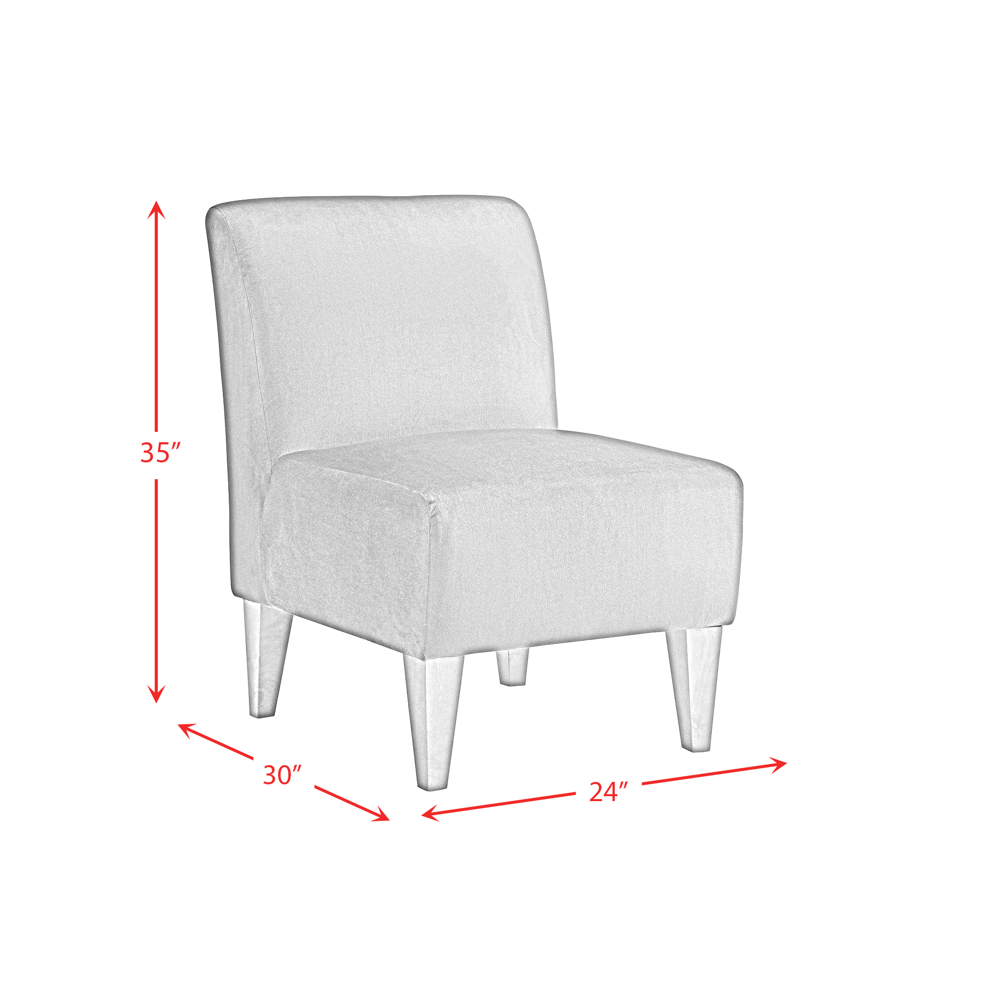 The Scarlett Accent Slipper Chair is a charming slipper chair covered with a stylish fabric upholstery. Its chic armless design sits low to the ground making it the perfect complement to a dressing room or any seating area in your home. The soft, velvet fabric gives you a modern glam look that will instantly make your space feel chic. From neutral to vibrant, this chair comes in different colors to fit any personality. Add this accent chair to your home today for a look that you will love to come home to. 1 Year Limited Manufacturer Warranty