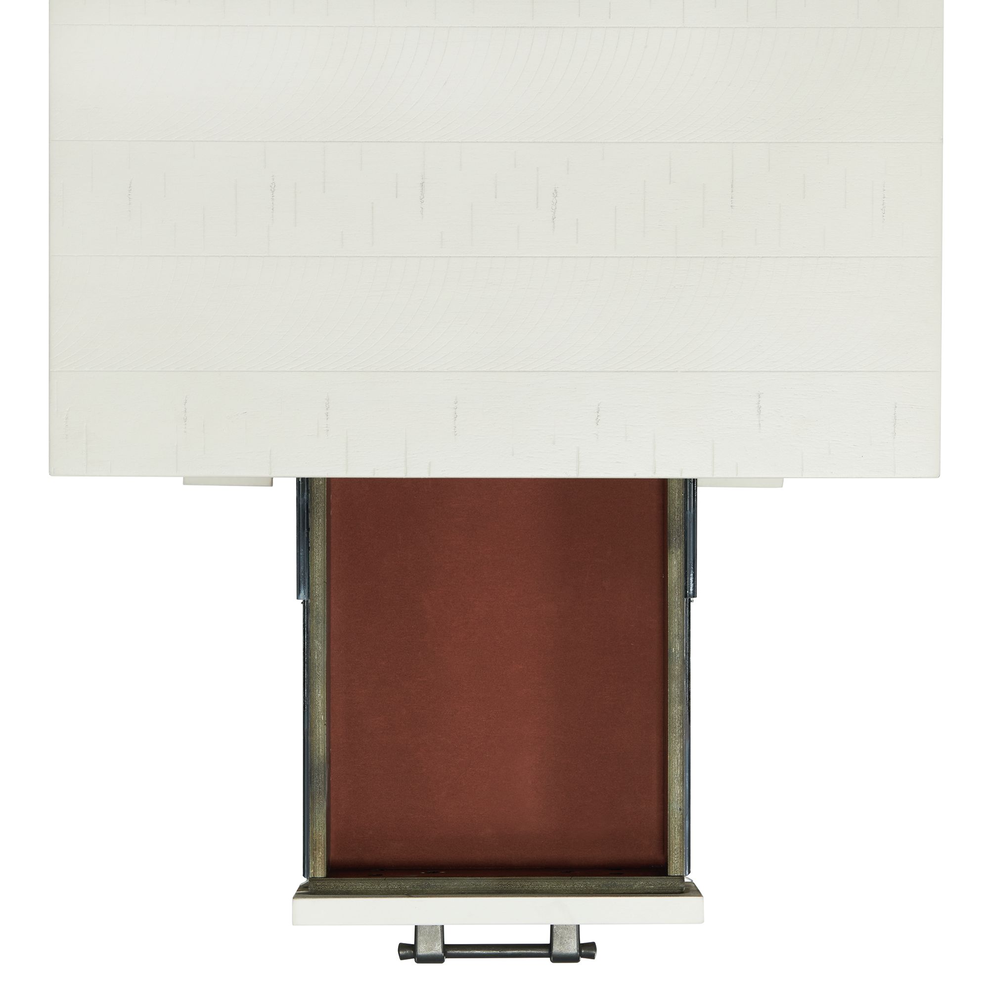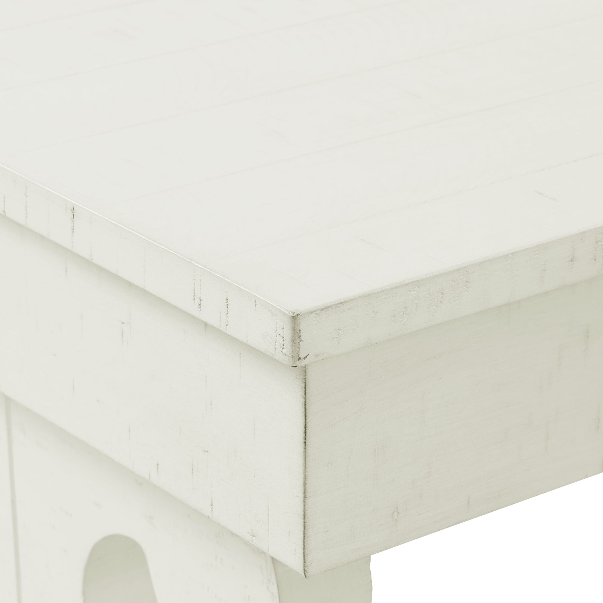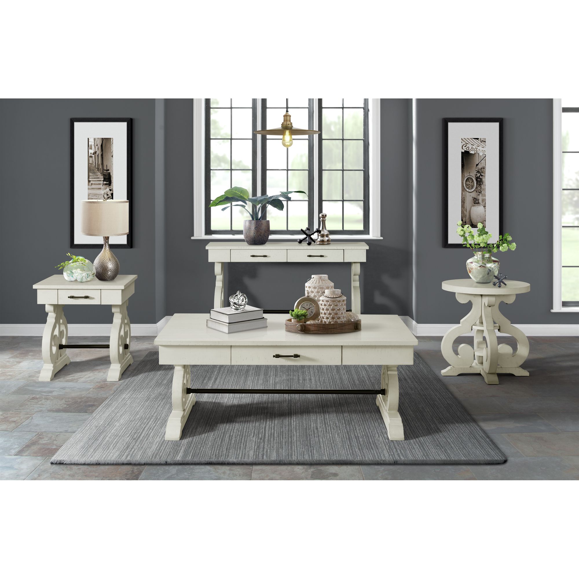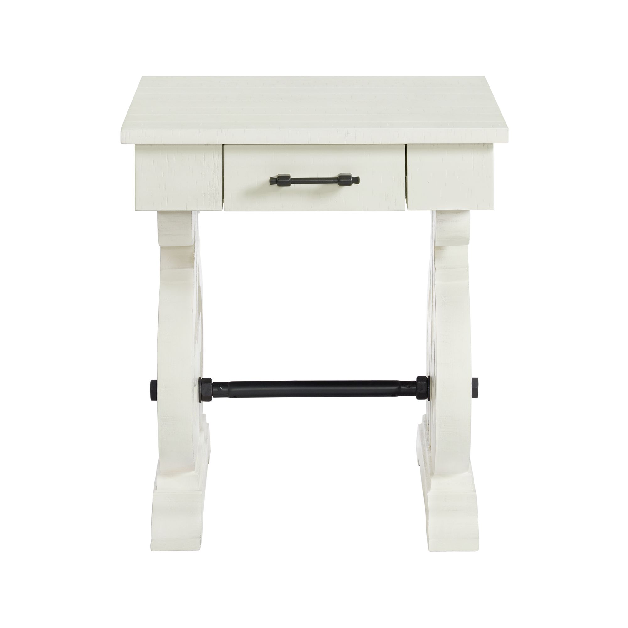 Stone Trestle Square End Table is the perfect addition to your living room! This end table features trestle legs, giving an updated look to this living room staple. The stretcher base not only provides functionality to the table, but also adds interest to the overall look. Never lose your remotes again with the convenient drawer. The small, but spacious drawer in the center of the table, will keep your remotes and other devices perfectly in place when youre not using them. The white finish with distressed markings complete the look of this transitional design. 1 Year Limited Manufacturer Warranty