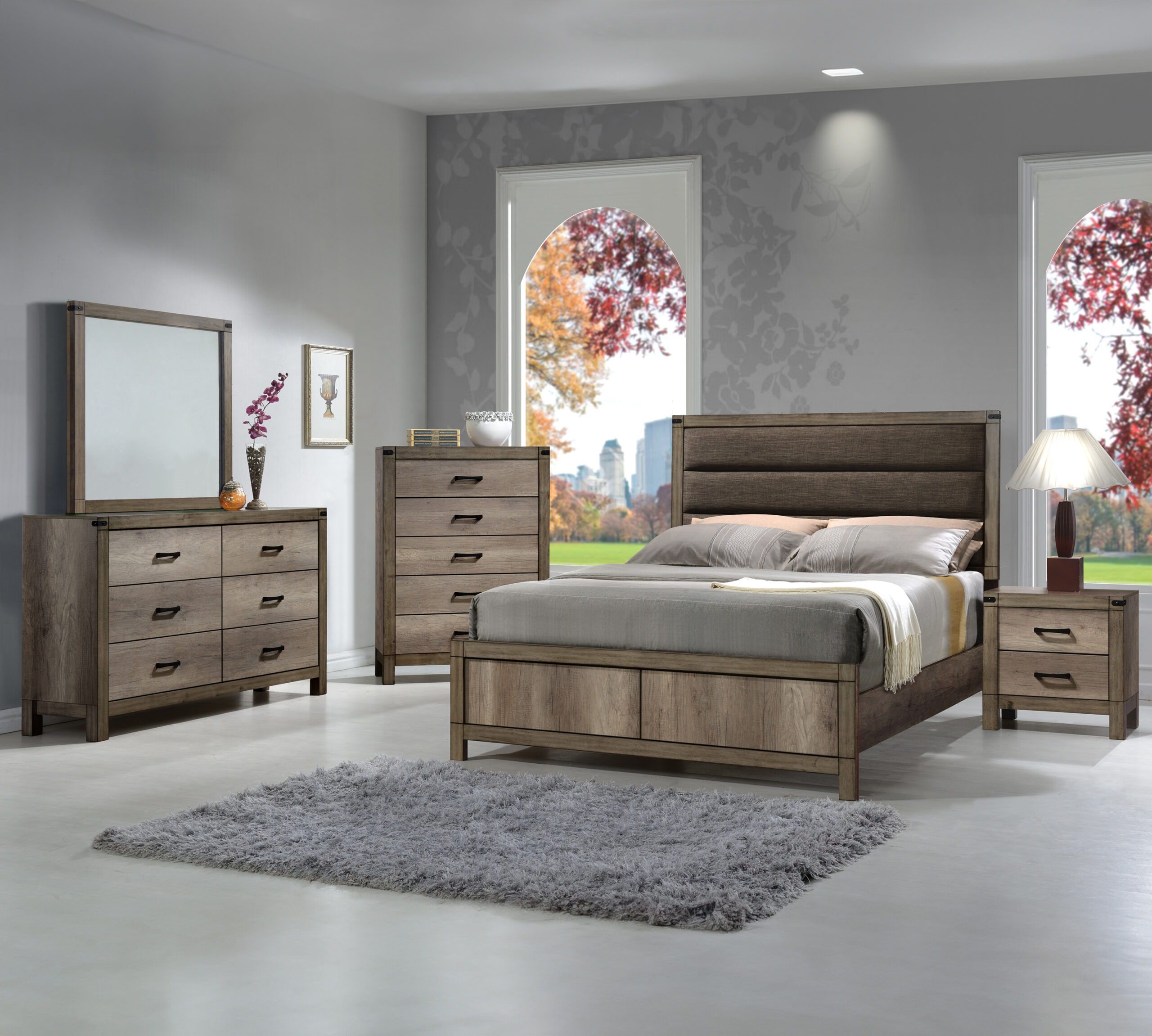 Step into a realm of contemporary sophistication with this bedroom collection. Flaunting a harmonious blend of rich, warm wood tones and bold, metallic accents, each piece exudes a luxe yet inviting appeal. The bed, with its sleek, linear design and striking headboard, becomes the centerpiece, complemented by storage options that blend functionality with chic, clean lines.
