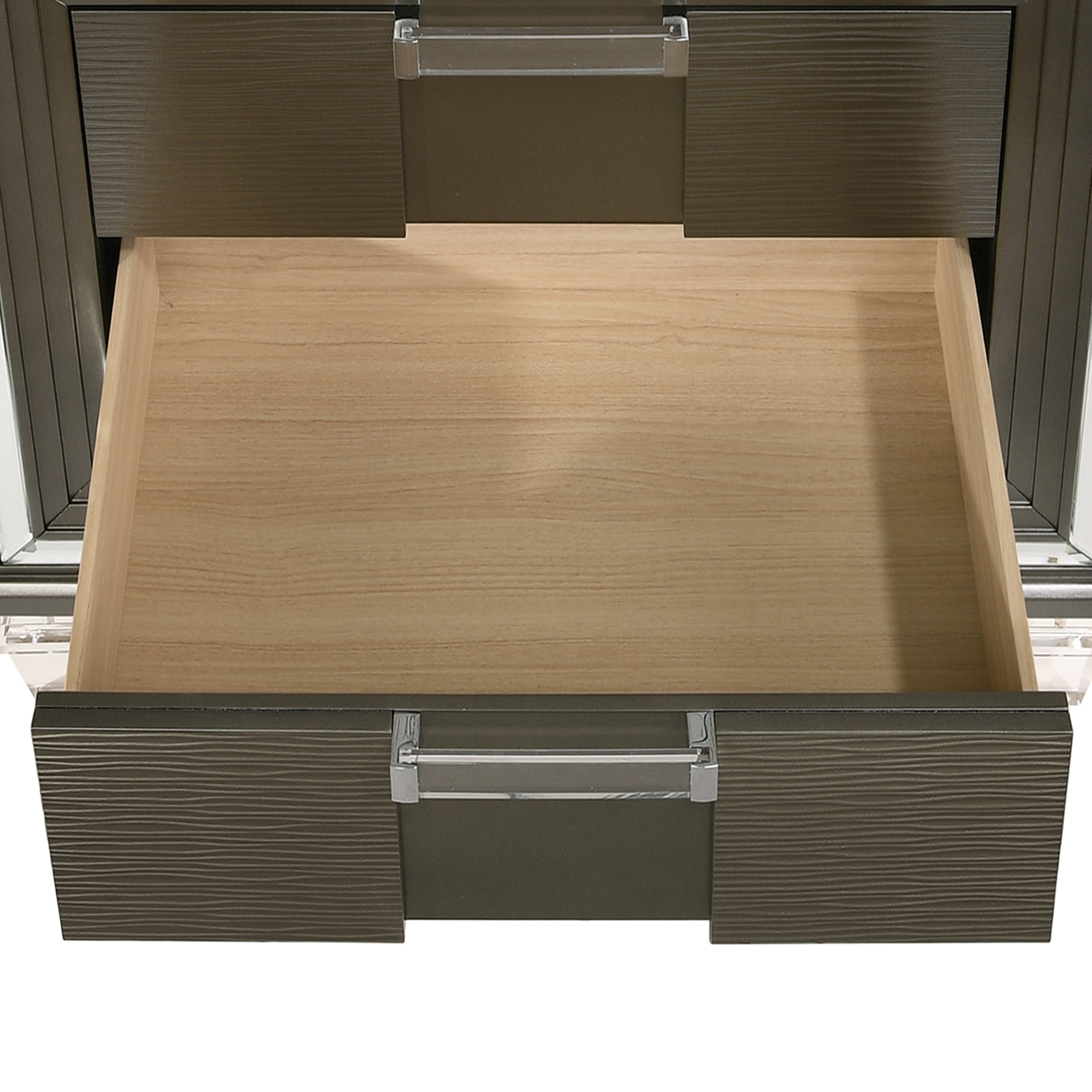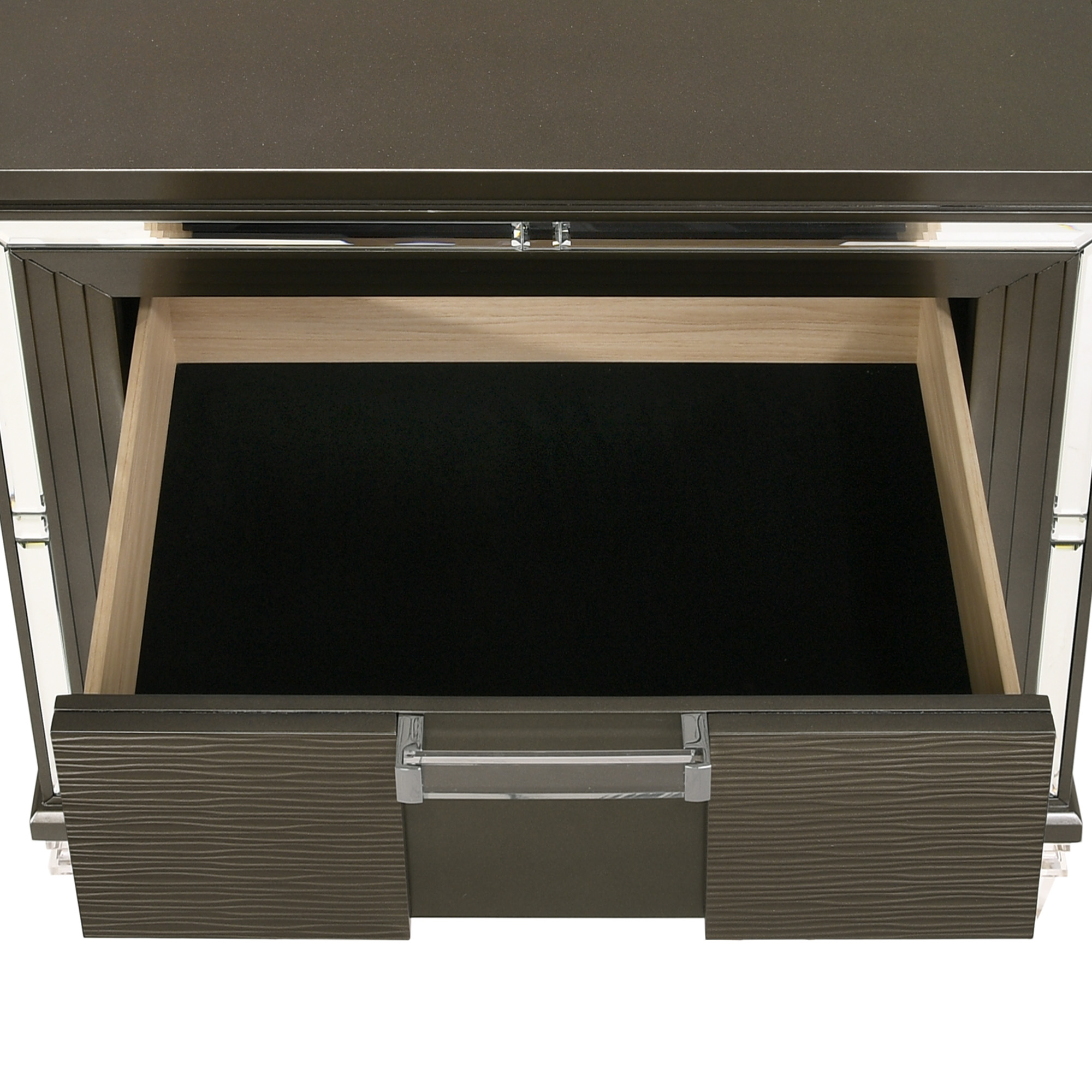 The Twenty Nine 2-Drawer Nightstand is the perfect bed side staple! This nightstand comes equipped with two USB ports that will keep your devices charged while you sleep. Theres also plenty of bed side storage thanks to its two spacious drawers. The top drawer is felt-lined, which is perfect for storing away your more delicate belongings. The front of the frame features a mirror glass trim, giving this nightstand its glamorous style. Clear, acrylic drawer pulls and feet complete the look of this stunning nightstand. 1 Year Limited Manufacturer Warranty