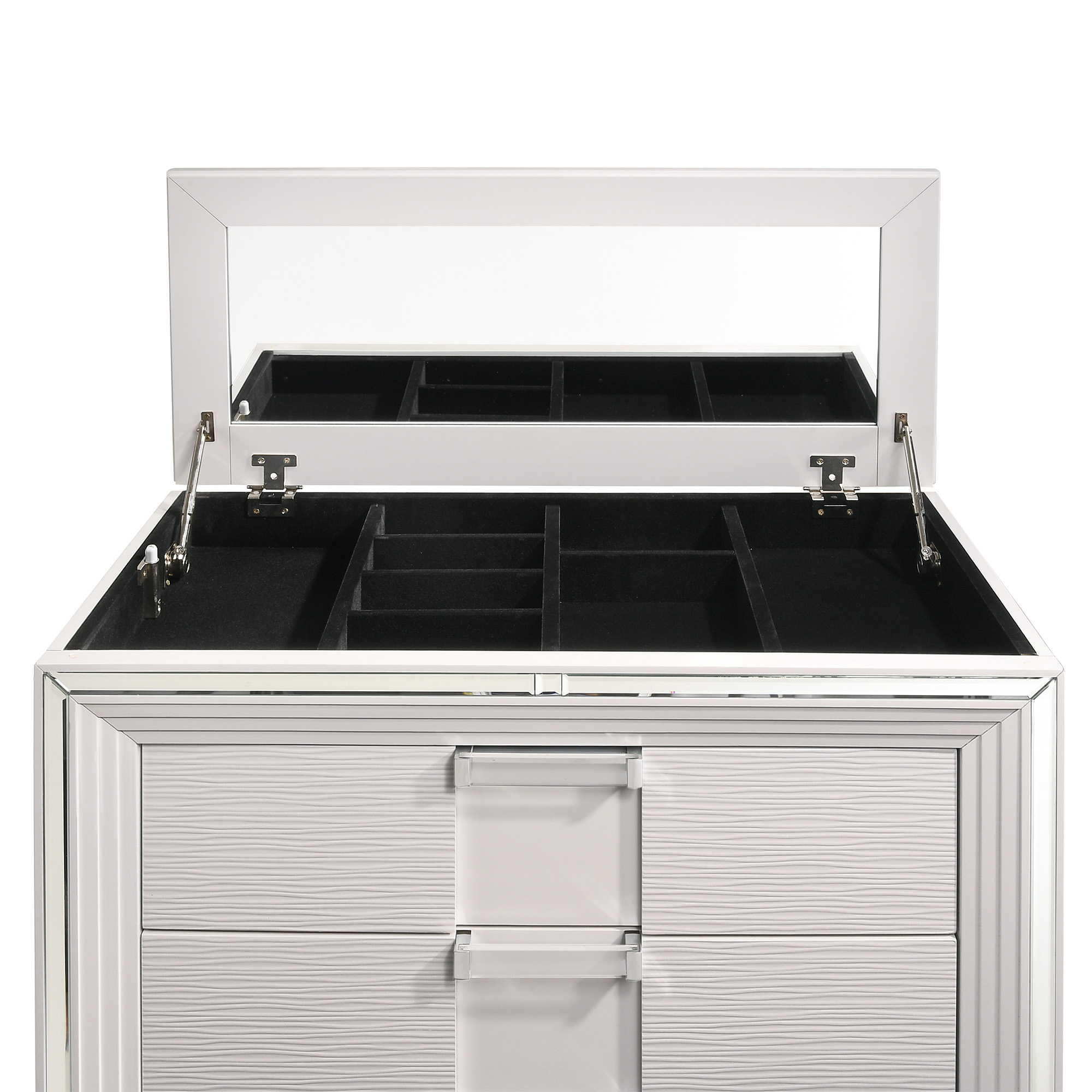 Twenty Nine Queen Storage 6PC Bedroom Set is bedroom goals! This six piece set includes a platform storage bed, dresser, mirror, chest and two nightstands. The bed is not only gorgeous, but also super practical. The headboard and mirror feature an LED mood lighting, creating the perfect ambience while you wind down. The footboard comes with two, spacious storage drawers making it easy to store away extra linens. The case pieces also offer plenty of storage space for your belongings. A cool feature the nightstands offer, two USB ports, which frees up one of your outlets and keeps your devices charged while you sleep. Mirror glass trim is present throughout the collection and clear, acrylic drawer pulls and feet complement the white finish beautifully. 1 Year Limited Manufacturer Warranty