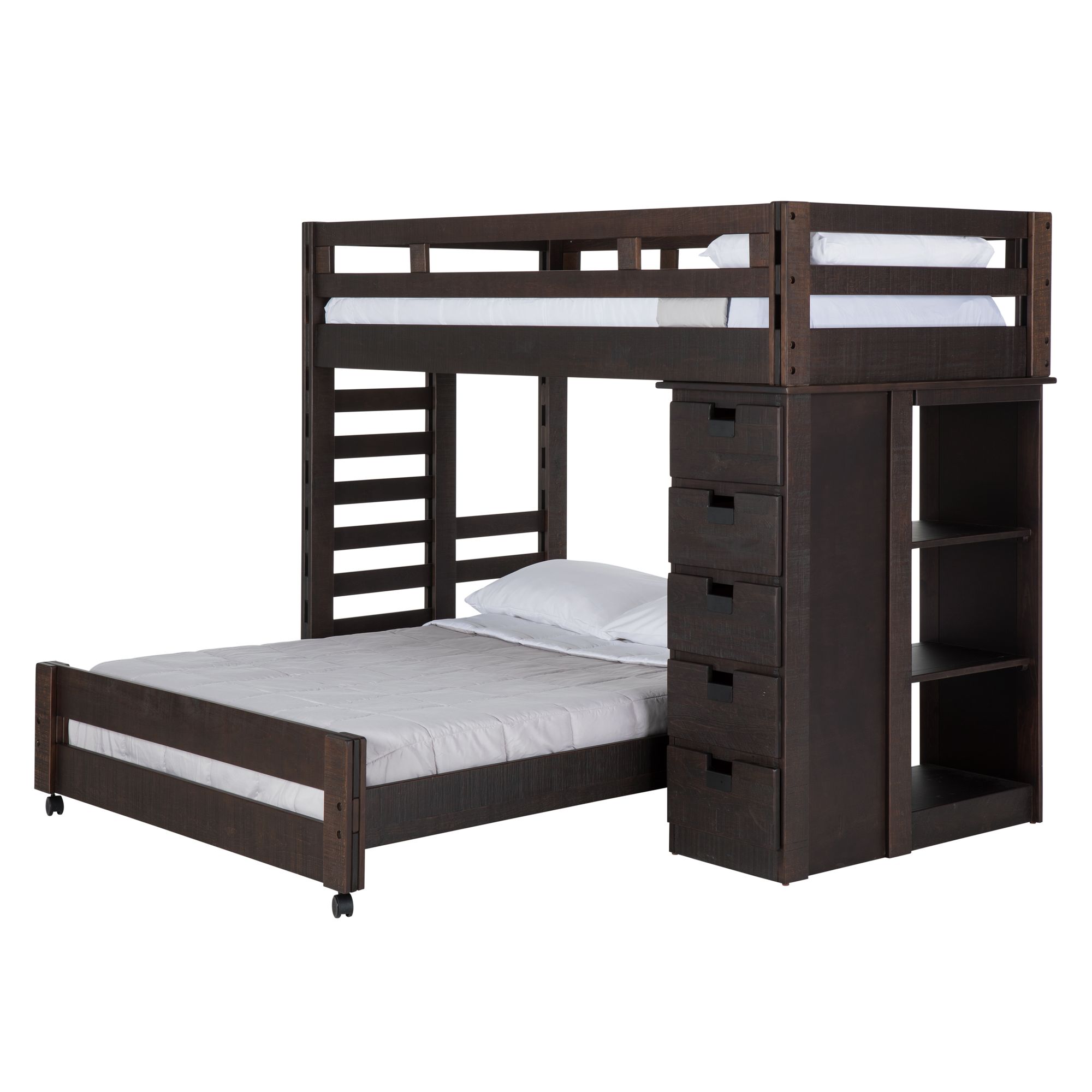 The Vista Brown Twin Over Full Basic Loft Bed with Bookcase combines all your bedroom needs in one piece! With an attached bookcase, this piece makes small rooms feel spacious with it’s compact features and sleek look. In addition to the spacious bookcase, this piece features 5 deep drawers for plenty of storage options. You do not want to miss out on this versatile bed! 1 Year Limited Manufacturer Warranty